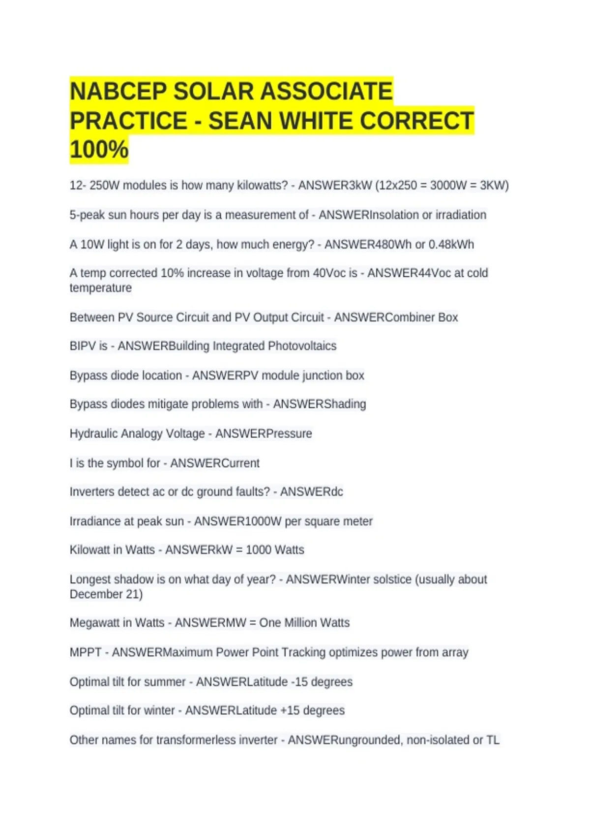 12- 250W modules is how many kilowatts? - ANSWER3kW (12x250 = 3000W = 3KW)