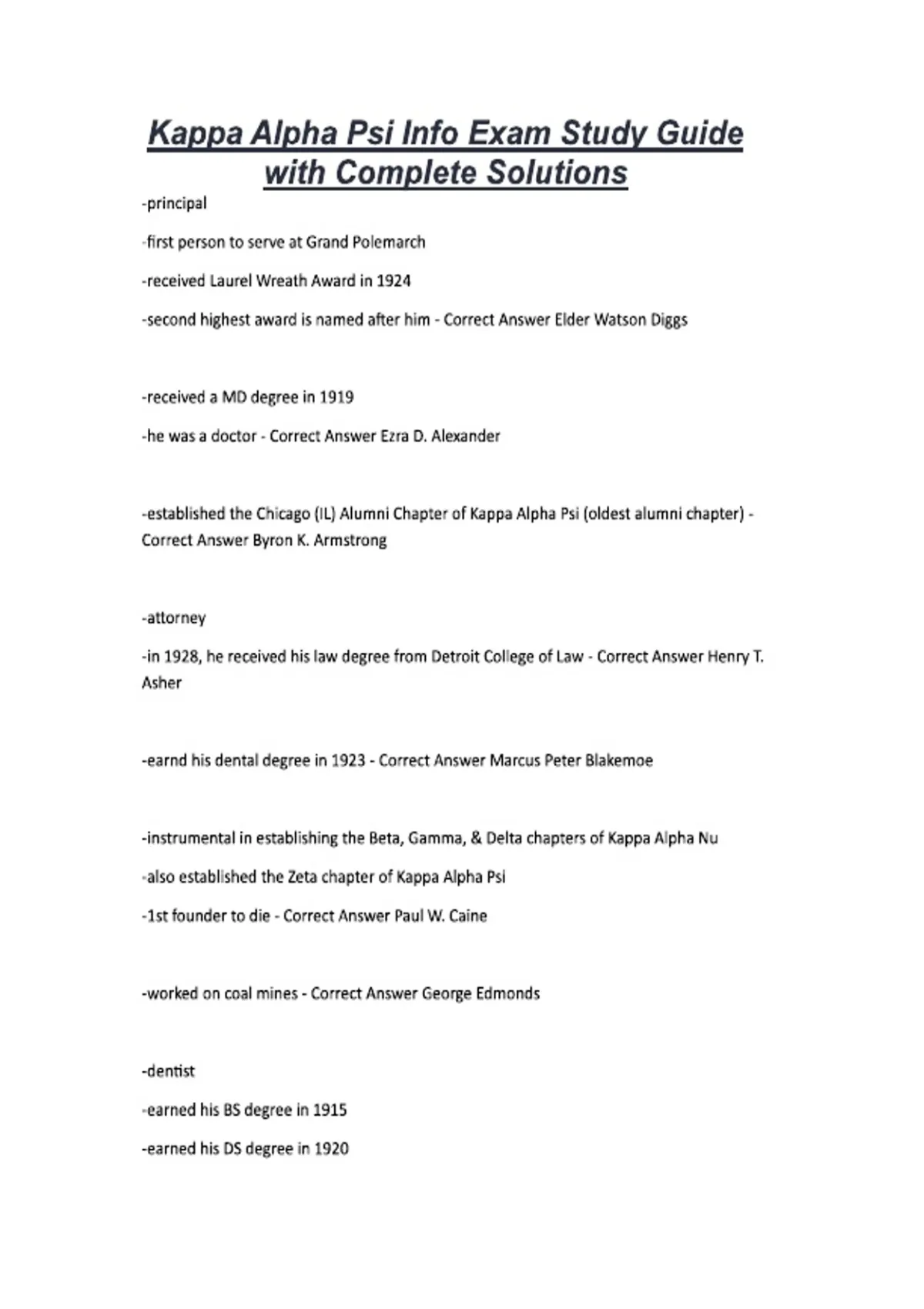 Kappa Alpha Psi Info Exam Study Guide with Complete Solutions -principal -first person to serve at Grand Polemarch -received Laurel Wreath Award in 1924 -second highest award is named after him - Correct Answer Elder Watson Diggs -received a MD degree in 1919 -he was a doctor - Correct Answer Ezra D. Alexander -established the Chicago (IL) Alumni Chapter of Kappa Alpha Psi (oldest alumni chapter) - Correct Answer Byron K. Armstrong -attorney -in 1928, he received his law degree from Detroit College of Law - Correct Answer Henry T. Asher -earnd his dental degree in 1923 - Correct Answer Marcus Peter Blakemoe -instrumental in establishing the Beta, Gamma, & Delta chapters of Kappa Alpha Nu -also established the Zeta chapter of Kappa Alpha Psi -1st founder to die - Correct Answer Paul W. Caine -worked on coal mines - Correct Answer George Edmonds -dentist -earned his BS degree in 1915 -earned his DS degree in 1920 -he was the Grand Historian & Emeritus of Kappa Alpha Psi - Correct Answer Guy L. Grant -left college to pursue journalism -established The Shinning Star newspaper in 1922 - Correct Answer Edward G. Irvin -established the Lambda chapter of Kappa Alpha Psi -served as sergant first class -1st negro to open fire at Germany - Correct Answer John Milton Lee