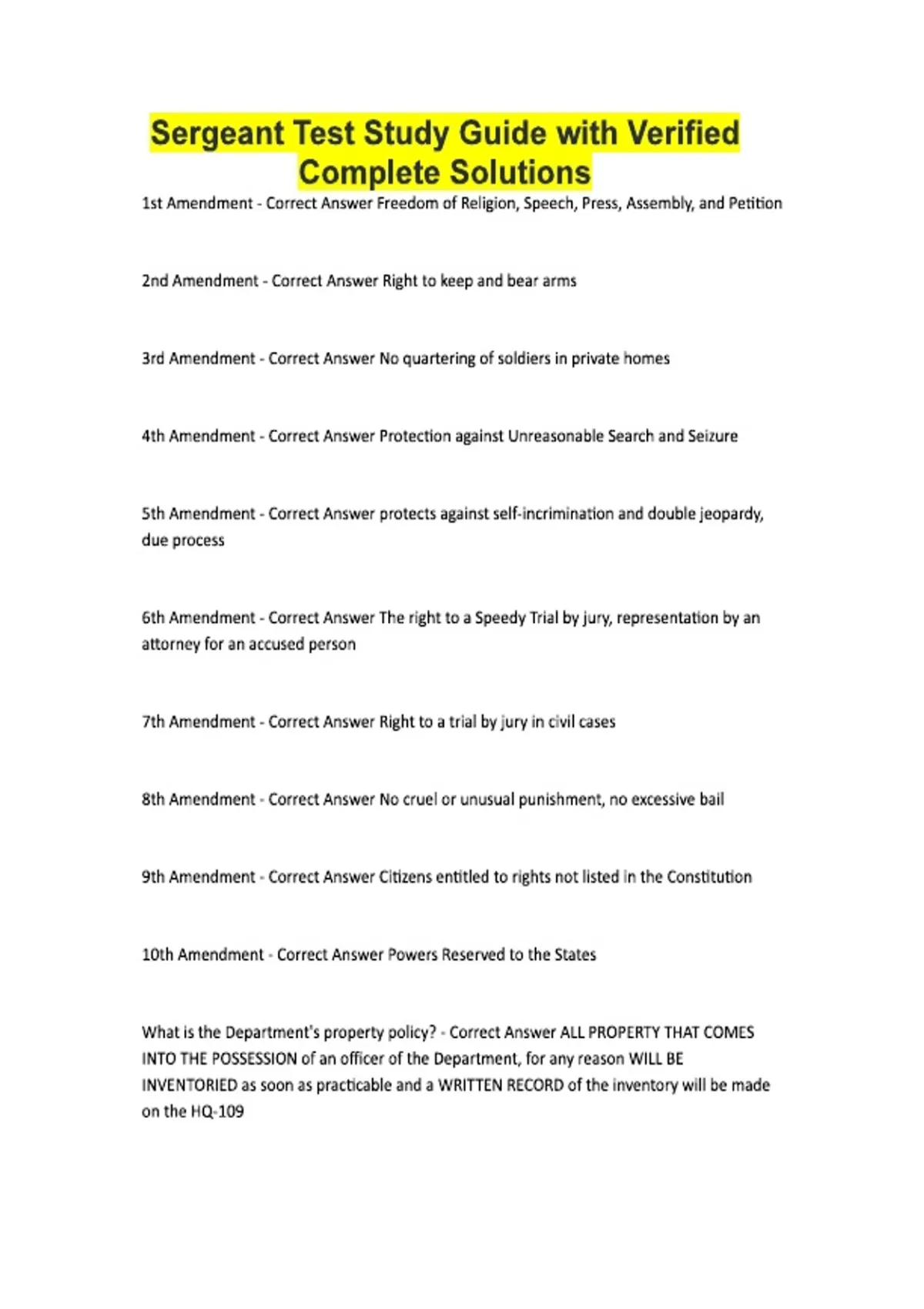 Sergeant Test Study Guide with Verified Complete Solutions 1st Amendment - Correct Answer Freedom of Religion, Speech, Press, Assembly, and Petition 2nd Amendment - Correct Answer Right to keep and bear arms 3rd Amendment - Correct Answer No quartering of soldiers in private homes 4th Amendment - Correct Answer Protection against Unreasonable Search and Seizure 5th Amendment - Correct Answer protects against self-incrimination and double jeopardy, due process 6th Amendment - Correct Answer The right to a Speedy Trial by jury, representation by an attorney for an accused person 7th Amendment - Correct Answer Right to a trial by jury in civil cases 8th Amendment - Correct Answer No cruel or unusual punishment, no excessive bail 9th Amendment - Correct Answer Citizens entitled to rights not listed in the Constitution 10th Amendment - Correct Answer Powers Reserved to the States What is the Department's property policy? - Correct Answer ALL PROPERTY THAT COMES INTO THE POSSESSION of an officer of the Department, for any reason WILL BE INVENTORIED as soon as practicable and a WRITTEN RECORD of the inventory will be made on the HQ-109 How do you invent