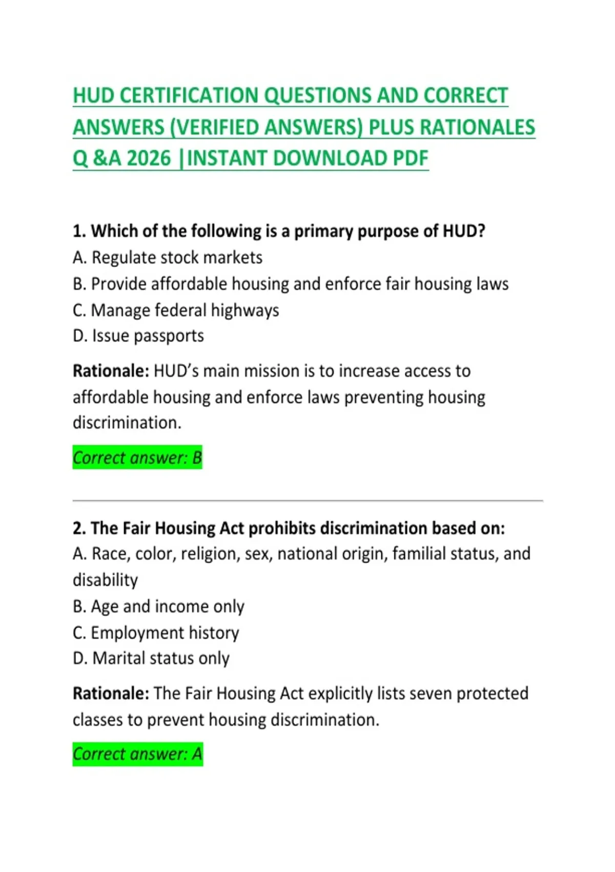 This guide contains HUD certification exam questions and correct answers to help learners prepare for housing and urban development certification assessments. It reviews important topics such as HUD regulations, fair housing requirements, eligibility determination, income verification, occupancy standards, and compliance procedures. The material is useful for housing professionals, property managers, and anyone studying for HUD-related certification exams.