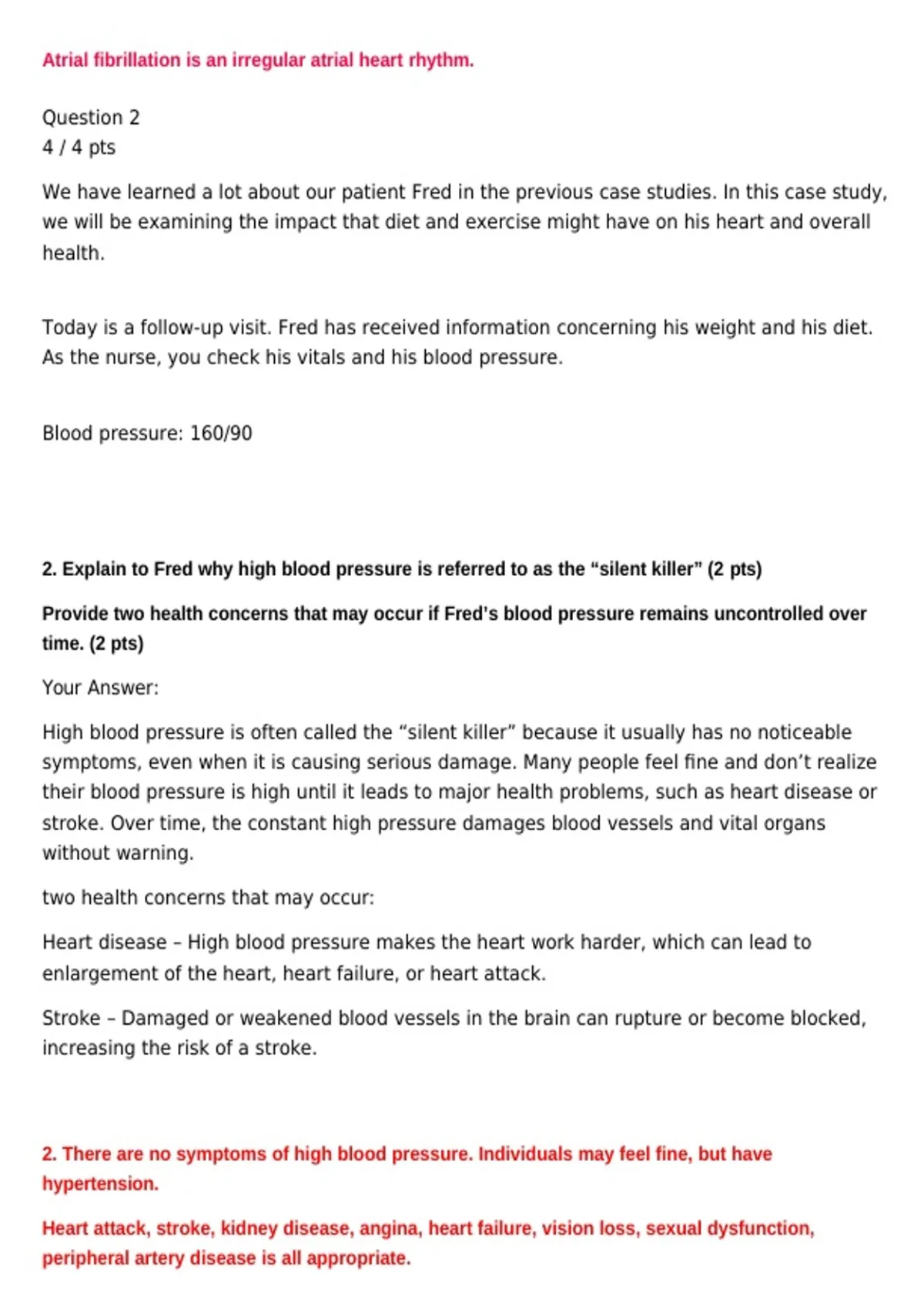 2. Explain to Fred why high blood pressure is referred to as the “silent killer” (2 pts)