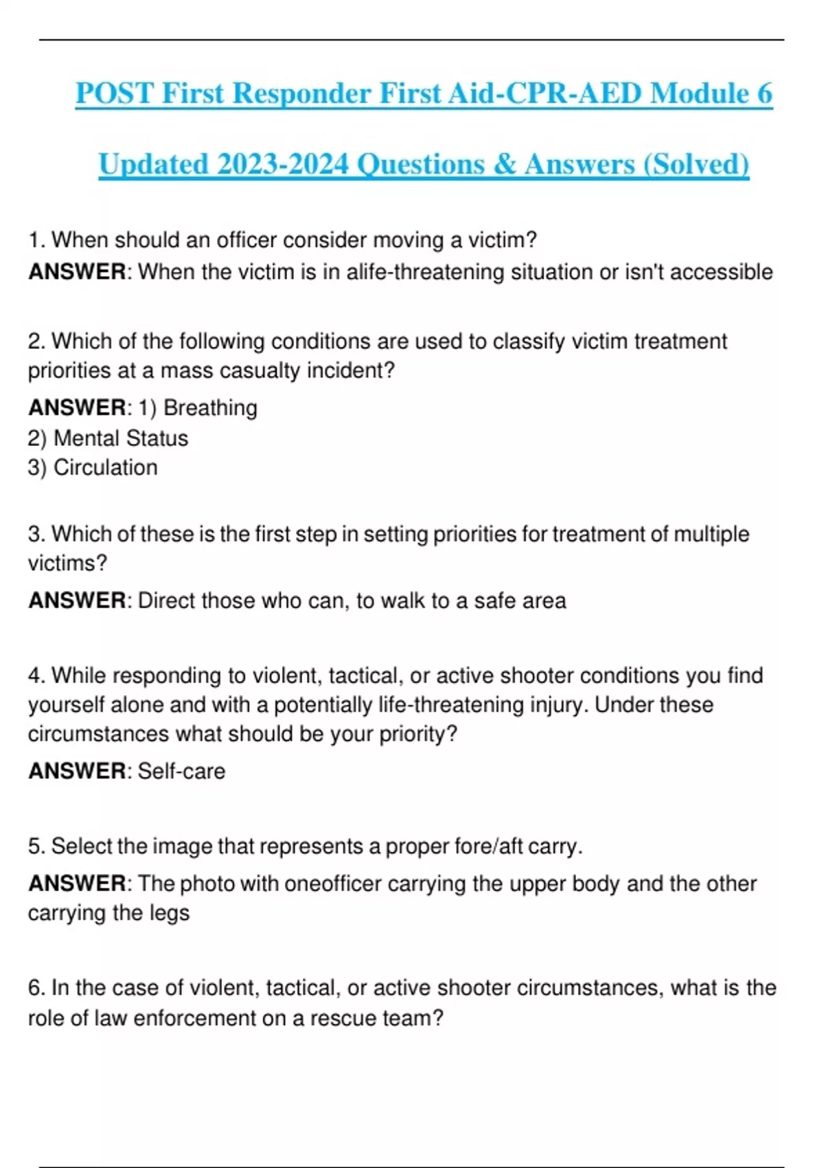 POST First Responder First Aid-CPR-AED Module 6 Updated Questions & Answers (Solved)