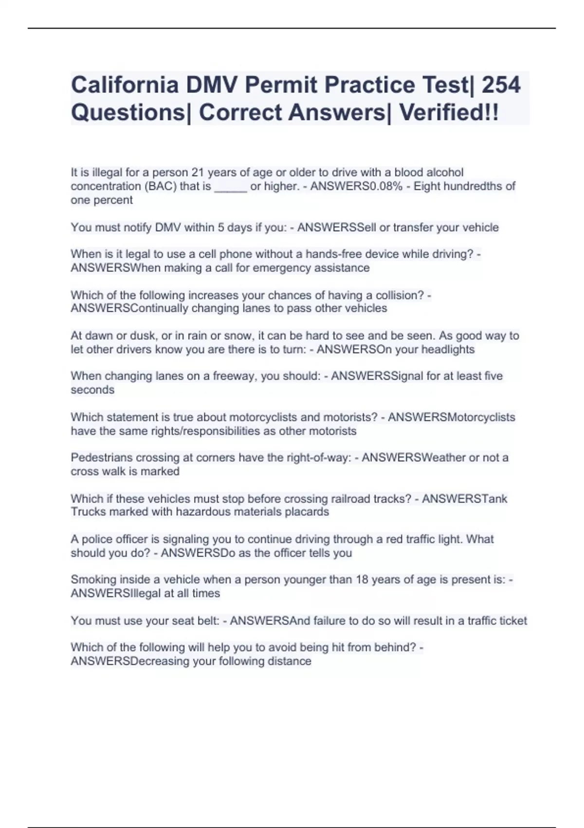 California DMV Permit Practice Test| 254 Questions| Correct Answers| Verified!!