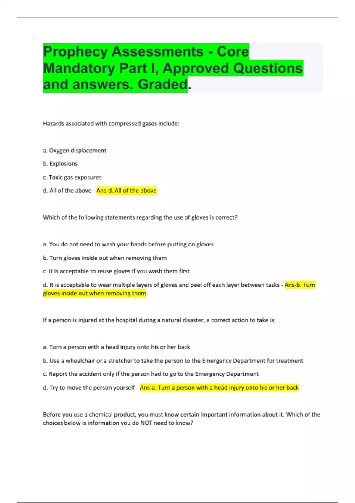 Prophecy Assessments - Core Mandatory Part I, Approved Questions and answers. Graded. Document Content and Description Below Hazards associated with compressed gases include: a. Oxygen displacement b. Explosions c. Toxic gas exposures d. All of the above - Ans-d. All of the above Which of the following statements r egarding the use of gloves is correct? a. You do not need to wash your hands before putting on gloves b. Turn gloves inside out when removing them c. It is acceptable to reuse gloves if you wash them first d. It is acceptable to wear multiple layers of gloves and peel off each layer between tasks - Ans-b. Turn gloves inside out when removing them If a person is injured at the hospital during a natural disaster, a correct action to take is: a. Turn a person with a head injury onto his or her back b. Use a wheelchair or a stretcher to take the person to the Emergency Department for treatment c. Report the accident only if the person had to go to the Emergency Department d. Try to move the person yourself - Ans-a. Turn a person with a head injury onto his or her back Before you use a chemical product, you must know certain important information about it. Which of the choices below is information you do NOT need to know? a. Proper use of the product b. What chemicals the product contains c. Treatment if accidentally exposed to it d. Precautions for safe handling - Ans-b. What chemicals the product contains Healthcare workers who must comply with HIPAA privacy requirements are: a. Doctors, nurses, and others providing direct patient care b. Environmental Services staff c. Engineering staff d. All of the above - Ans-d. All of the above Which of the following is NOT required on a chemical label? a. A signal word b. Your facility's name c. A hazard statement d. A pictogram - Ans-b. Your facility's name The acronym P.A.S.S. is used to help remember: a. How to use a fire extinguisher b. How to evacuate patients c. How to spread the word about a fire d. None of the above - Ans-a. How to