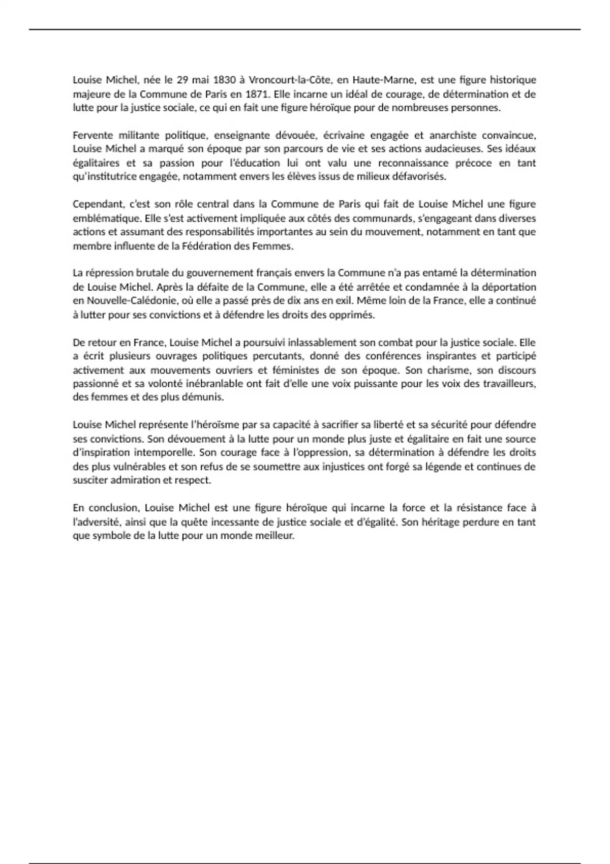 Petit résumé d'une page résumant le parcours héroïque de Louise Michel, militant anarchiste