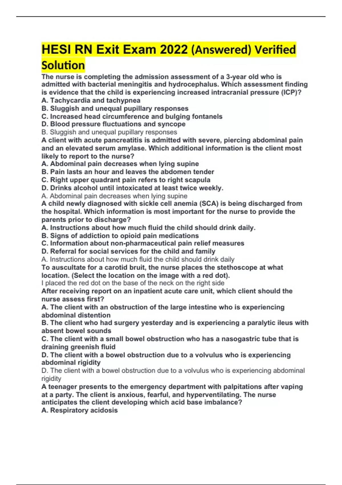 HESI RN Exit Exam 2022 (Answered) Verified Solution The nurse is completing the admission assessment of a 3-year old who is admitted with bacterial meningitis and hydrocephalus. Which assessment finding is evidence that the child is experiencing increased intracranial pressure (ICP)? A. Tachycardia and tachypnea B. Sluggish and unequal pupillary responses C. Increased head circumference and bulging fontanels D. Blood pressure fluctuations and syncope B. Sluggish and unequal pupillary responses A client with acute pancreatitis is admitted with severe, piercing abdominal pain and an elevated serum amylase. Which additional information is the client most likely to report to the nurse? A. Abdominal pain decreases when lying supine B. Pain lasts an hour and leaves the abdomen tender C. Right upper quadrant pain refers to right scapula D. Drinks alcohol until intoxicated at least twice weekly. A. Abdominal pain decreases when lying supine A child newly diagnosed with sickle cell anemia (SCA) is being discharged from the hospital. Which information is most important for the nurse to provide the parents prior to discharge? A. Instructions about how much fluid the child should drink daily. B. Signs of addiction to opioid pain medications C. Information about non-pharmaceutical pain relief measures D. Referral for social services for the child and family A. Instructions about how much fluid the child should drink daily To auscultate for a carotid bruit, the nurse places the stethoscope at what location. (Select the location on the image with a red dot). I placed the red dot on the base of the neck on the right side After receiving report on an inpatient acute care unit, which client should the nurse assess first? A. The client with an obstruction of the large intestine who is experiencing abdominal distention B. The client who had surgery yesterday and is experiencing a paralytic ileus with absent bowel sounds C. The client with a small bowel obstruction who has a nasogastric tube that is draining greenish fluid D. The client with a bowel obstruction due to a volvulus who is experiencing abdominal rigidity D. The client with a bowel obstruction due to a volvulus who is experiencing abdominal rigidity A teenager presents to the emergency department with palpitations after vaping at a party. The client is anxious, fearful, and hyperventilating. The nurse anticipates the client developing which acid base imbalance? A. Respiratory acidosis B. Metabolic alkalosis C. Metabolic acidosis D. Respiratory alkalosis D. Respiratory alkalosis A client with dyspnea is being admitted to the medical unit. To best prepare for the client's arrival, the nurse should ensure that the client's bed is in which position? A. Supine B. supine; feet elevated higher than head C. supine; head elevated higher than feet D. Fowlers Fowlers The nurse is taking the blood pressure measurement of a client with Parkinson's disease. Which information in the client's admission assessment is relevant to the nurse's plan for taking the blood pressure reading? (Select all the apply) A. Frequent syncope B. Occasional nocturia C. Flat affect D. Blurred vision E. Frequent drooling A. Frequent syncope C. Flat affect D. Blurred vision While caring for a client's postoperative dressing, the nurse observes purulent drainage at the wound. Before reporting this finding to the healthcare provider, the nurse should review which of the client's laboratory values? A. Serum albumin B. Culture for sensitive organisms C. Serum blood glucose level D. Creatinine level B. Culture for sensitive organisms A preschool-aged boy is admitted to the pediatric unit following successful resuscitation from a near-drowning incident. While providing care to the child, the nurse begins talking with his preadolescent brother who rescued the child from the swimming pool and initiated resuscitation. The nurse notices the older boy becomes withdrawn when asked about what happened. Which action should the nurse take? A. Develop a water safety teaching plan for the family B. Ask the older brother how he felt during the incident C. Tell the older brother that he seems depressed D. Commend the older brother for his heroic actions B. Ask the older brother how he felt during the incident A male client with cirrhosis has jaundice and pruritus. He tells the nurse that he has been soaking in hot baths at night with no relief of his discomfort. Which action should the nurse take? A. Encourage the client to use cooler water and apply calamine lotion after