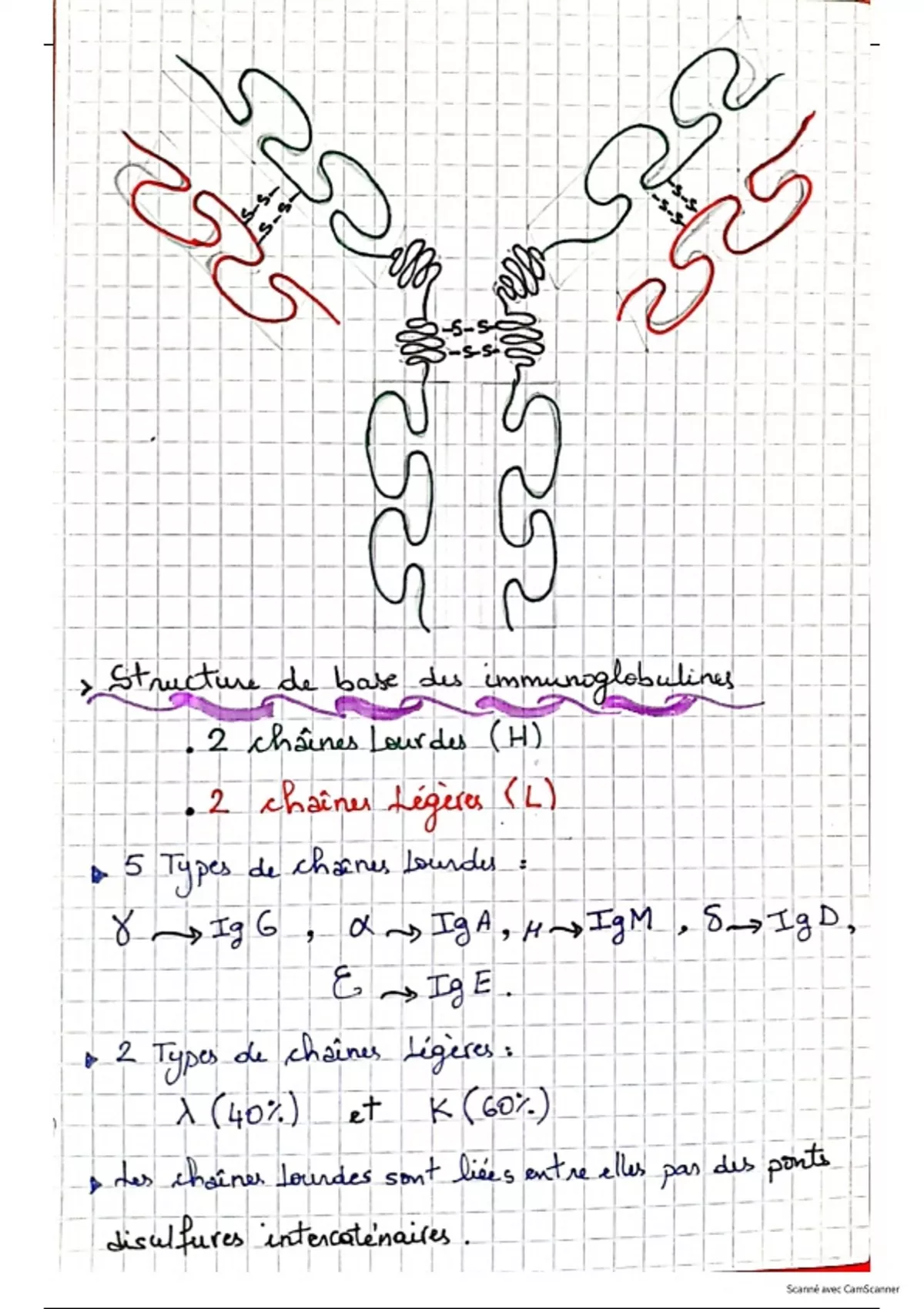 le document résume la structure des immunoglobulines, éléments cruciales dans la réponse immunitaire, sous forme de dessins avec une description brève de chaque protéine