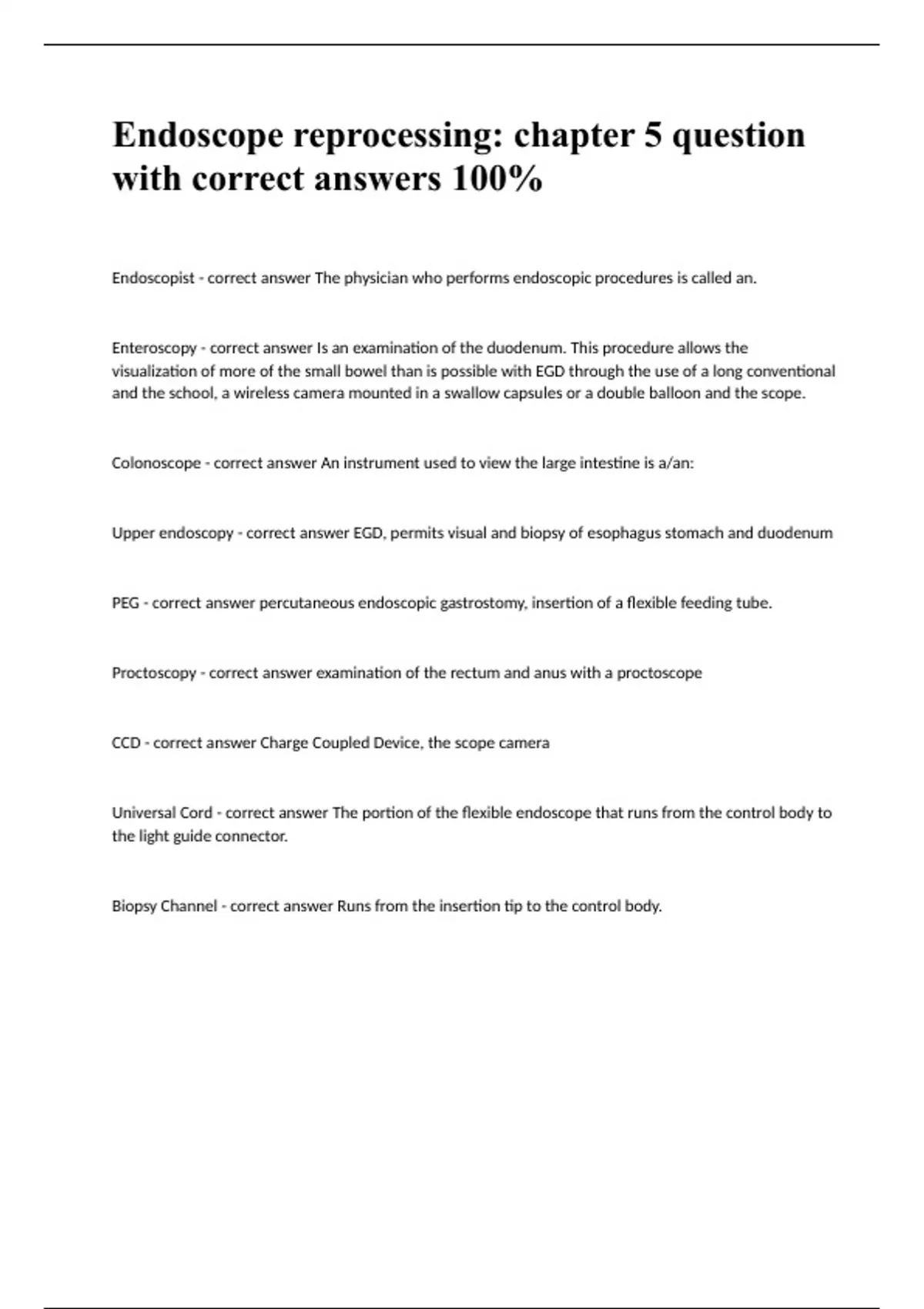 Endoscope reprocessing: chapter 5 question with correct answers 100% Endoscopist - correct answer The physician who performs endoscopic procedures is called an. Enteroscopy - correct answer Is an examination of the duodenum. This procedure allows the visualization of more of the small bowel than is possible with EGD through the use of a long conventional and the school, a wireless camera mounted in a swallow capsules or a double balloon and the scope. Colonoscope - correct answer An instrument used to view the large intestine is a/an: Upper endoscopy - correct answer EGD, permits visual and biopsy of esophagus stomach and duodenum PEG - correct answer percutaneous endoscopic gastrostomy, insertion of a flexible feeding tube. Proctoscopy - correct answer examination of the rectum and anus with a proctoscope CCD - correct answer Charge Coupled Device, the scope camera Universal Cord - correct answer The portion of the flexible endoscope that runs from the control body to the light guide connector. Biopsy Channel - correct answer Runs from the insertion tip to the control body
