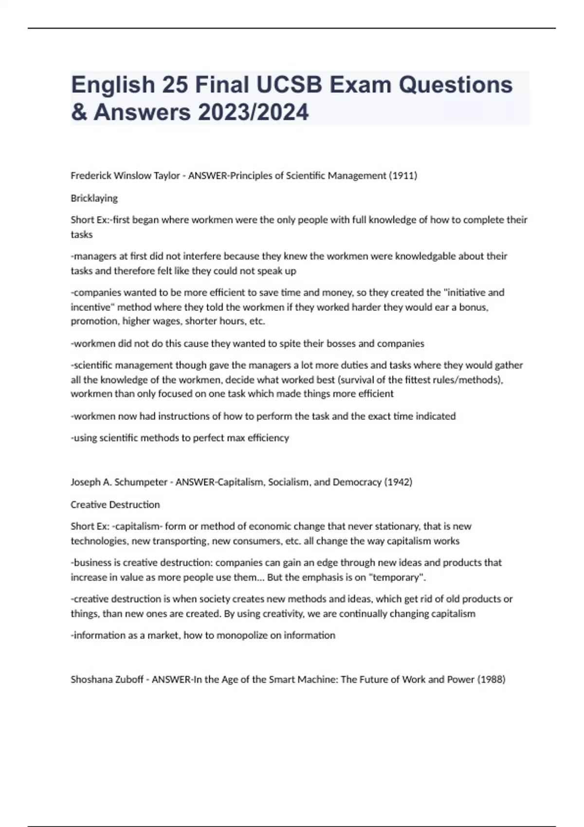 English 25 Final UCSB Exam Questions & Answers 2023/2024 Frederick Winslow Taylor - ANSWER-Principles of Scientific Management (1911) Bricklaying Short Ex:-first began where workmen were the only people with full knowledge of how to complete their tasks -managers at first did not interfere because they knew the workmen were knowledgable about their tasks and therefore felt like they could not speak up -companies wanted to be more efficient to save time and money, so they created the "initiative and incentive" method where they told the workmen if they worked harder they would ear a bonus, promotion, higher wages, shorter hours, etc. -workmen did not do this cause they wanted to spite their bosses and companies -scientific management though gave the managers a lot more duties and tasks where they would gather all the knowledge of the workmen, decide what worked best (survival of the fittest rules/methods), workmen than only focused on one task which made things more efficient -workmen now had instructions of how to perform the task and the exact time indicated -using scientific methods to perfect max efficiency Joseph A. Schumpeter - ANSWER-Capitalism, Socialism, and Democracy (1942) Creative Destruction Short Ex: -capitalism- form or method of economic change that never stationary, that is new technologies, new transporting, new consumers, etc. all change the way capitalism works -business is creative destruction: companies can gain an edge through new ideas and products that increase in value as more people use them... But the emphasis is on "temporary". -creative destruction is when society creates new methods and ideas, which get rid of old products or things, than new ones are created. By using creativity, we are continually changing capitalism -information as a market, how to monopolize on information Shoshana Zuboff - ANSWER-In the Age of the Smart Machine: The Future of Work and Power (1988)