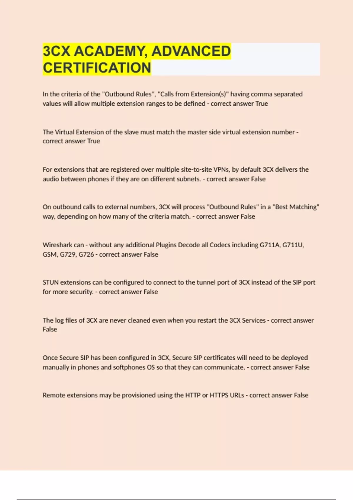 In the criteria of the "Outbound Rules", "Calls from Extension(s)" having comma separated values will allow multiple extension ranges to be defined True The Virtual Extension of the slave must match the master side virtual extension number True For extensions that are registered over multiple site-to-site VPNs, by default 3CX delivers the audio between phones if they are on different subnets. False On outbound calls to external numbers, 3CX will process "Outbound Rules" in a "Best Matching" way, depending on how many of the criteria match. False Wireshark can - without any additional Plugins Decode all Codecs including G711A, G711U, GSM, G729, G726 False STUN extensions can be configured to connect to the tunnel port of 3CX instead of the SIP port for more security. False The log files of 3CX are never cleaned even when you restart the 3CX Services False Once Secure SIP has been configured in 3CX, Secure SIP certificates will need to be deployed manually in phones and softphones OS so that they can communicate. False Remote extensions may be provisioned using the HTTP or HTTPS URLs False The default Voicemail PIN of an extension consist of 4 random alphanumerical characters. False Your 3CX has only one SIP Trunk and receives a call from number 1. If you have a "Inbound CID Reformatting" rule on the Trunk with "Source Pattern" 813(...)(.*) and "Replace Pattern" 12, the extension that receives the call will see "" as the caller ID on its display. True When 3CX has been installed without a FQDN from 3CX and in split DNS mode, the DNS server must not be installed on the same machine as the phone system. True Your Local IP Phone loses the registration to 3CX and you want do troubleshoot the issue. You should start a Wireshark Capture on the 3CX Server, reboot the phone, and then apply the Filter sip.Cseq.Method==REGISTER in order to see if registrations are reaching 3CX True Your 3CX has only one SIP Trunk and receives a call from number 020 and you want it to be presented on the extension display as +. You can do this with a "Inbound CID Reformatting" rule on the Trunk with "Source Pattern" 44(..)(..)(.*) and "Replace Pattern" +443. True When selecting the option "I need a 3CX FQDN" an internal DNS is not mandatory True The order of "Inbound Rules" is not important when you have DID and CID "Inbound Rules", CIDs always have higher priority. False You have a Master Bridge with 3-digit extensions 1xxx and a Slave Bridge with 4-digit extensions 2xxx. In the "Outbound Rules" you use to rote calls across the bridge, using a prefix is mandatory. False You have run the 3CX "Firewall Checker" and comes up as Green, but you still have audio issues and calls dropping on on outbound / inbound calls. Can SIP ALG be the culprit? True An extension will be allowed up to 25 attempts (default) for authenticating successfully, after what it will be blacklisted for the default blacklisting interval of 1800 minutes. False The 3CX SIP port should be filtered by firewall ACL rules to maximize security and allow only trusted IPs to reach it (VoIP providers or STUN extensions if any). True SRTP will secure calls so that a middle-man can't see the SIP traffic in plain-text. False CID and DID "Inbound Rules" can both be configured to route calls differently depending on the Office Hours. True "Prepend" will add digits to the end of the dialed number before sending hte call to the destination defined in the "Route" False Your Local IP Phone loses the Registration to 3CX and you want to troubleshoot the issue. You should start a Wireshark Capture on the 3CX Server, reboot the phone, and then apply the Filter sip.Cseq.Method==SUBSCRIBE in order to see if registrations are reaching 3CX. False