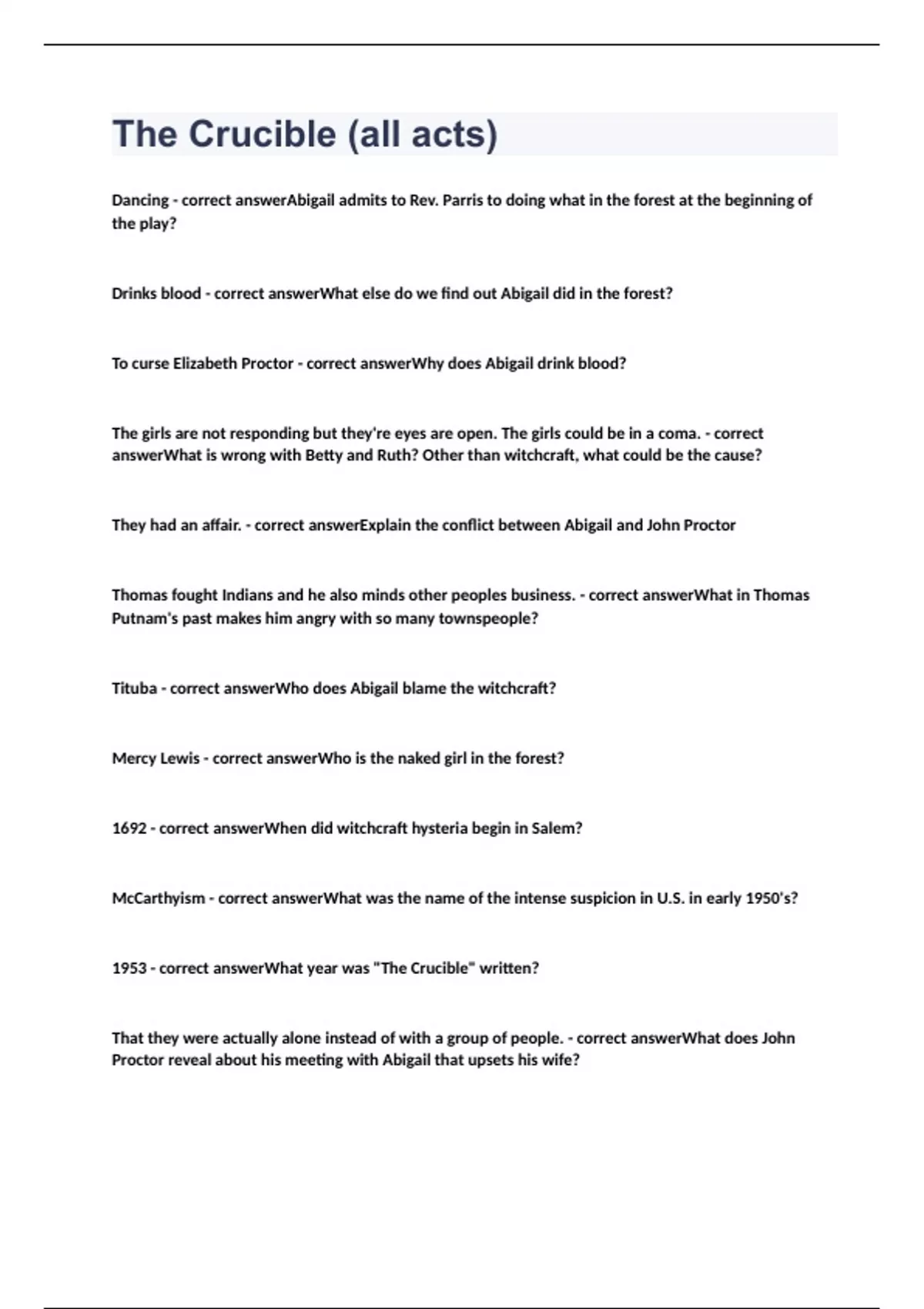the play? Drinks blood - correct answerWhat else do we find out Abigail did in the forest? To curse Elizabeth Proctor - correct answerWhy does Abigail drink blood? The girls are not responding but they're eyes are open. The girls could be in a coma. - correct answerWhat is wrong with Betty and Ruth? Other than witchcraft, what could be the cause? They had an affair. - correct answerExplain the conflict between Abigail and John Proctor Thomas fought Indians and he also minds other peoples business. - correct answerWhat in Thomas Putnam's past makes him angry with so many townspeople? Tituba - correct answerWho does Abigail blame the witchcraft? Mercy Lewis - correct answerWho is the naked girl in the forest? 1692 - correct answerWhen did witchcraft hysteria begin in Salem? McCarthyism - correct answerWhat was the name of the intense suspicion in U.S. in early 1950's? 1953 - correct answerWhat year was "The Crucible" written? That they were actually alone instead of with a group of people. - correct answerWhat does John Proctor reveal about his meeting with Abigail that upsets his wife? A poppet - correct answerWhat does Mary Warren make for Elizabeth Pro