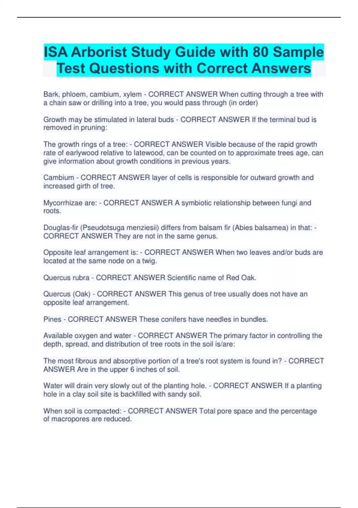 ISA Arborist Study Guide with 80 Sample Test Questions with Correct Answers