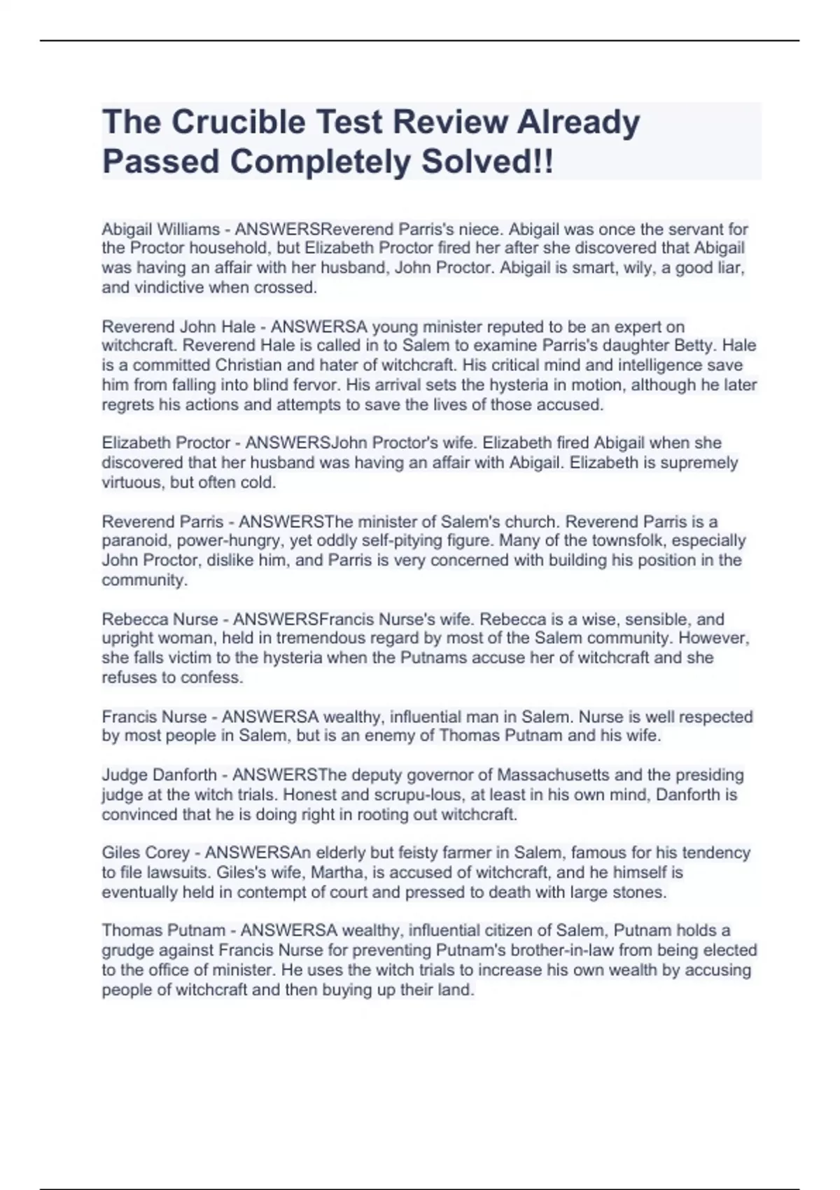 Abigail Williams - ANSWERSReverend Parris's niece. Abigail was once the servant for the Proctor household, but Elizabeth Proctor fired her after she discovered that Abigail was having an affair with her husband, John Proctor. Abigail is smart, wily, a good liar, and vindictive when crossed. Reverend John Hale - ANSWERSA young minister reputed to be an expert on witchcraft. Reverend Hale is called in to Salem to examine Parris's daughter Betty. Hale is a committed Christian and hater of witchcraft. His critical mind and intelligence save him from falling into blind fervor. His arrival sets the hysteria in motion, although he later regrets his actions and attempts to save the lives of those accused. Elizabeth Proctor - ANSWERSJohn Proctor's wife. Elizabeth fired Abigail when she discovered that her husband was having an affair with Abigail. Elizabeth is supremely virtuous, but often cold. Reverend Parris - ANSWERSThe minister of Salem's church. Reverend Parris is a paranoid, power-hungry, yet oddly self-pitying figure. Many of the townsfolk, especially John Proctor, dislike him, and Parris is very concerned with building his position in the community. Rebecca Nurse - ANSWERSFrancis Nurse's wife. Rebecca is a wise, sensible, and upright woman, held in tremendous regard by most of the Salem community. However, she falls victim to the hysteria when the Putnams accuse her of witchcraft and she refuses to confess. Francis Nurse - ANSWERSA wealthy, influential man in Salem. Nurse is well respected by most people in Salem, but is an enemy of Thomas Putnam a