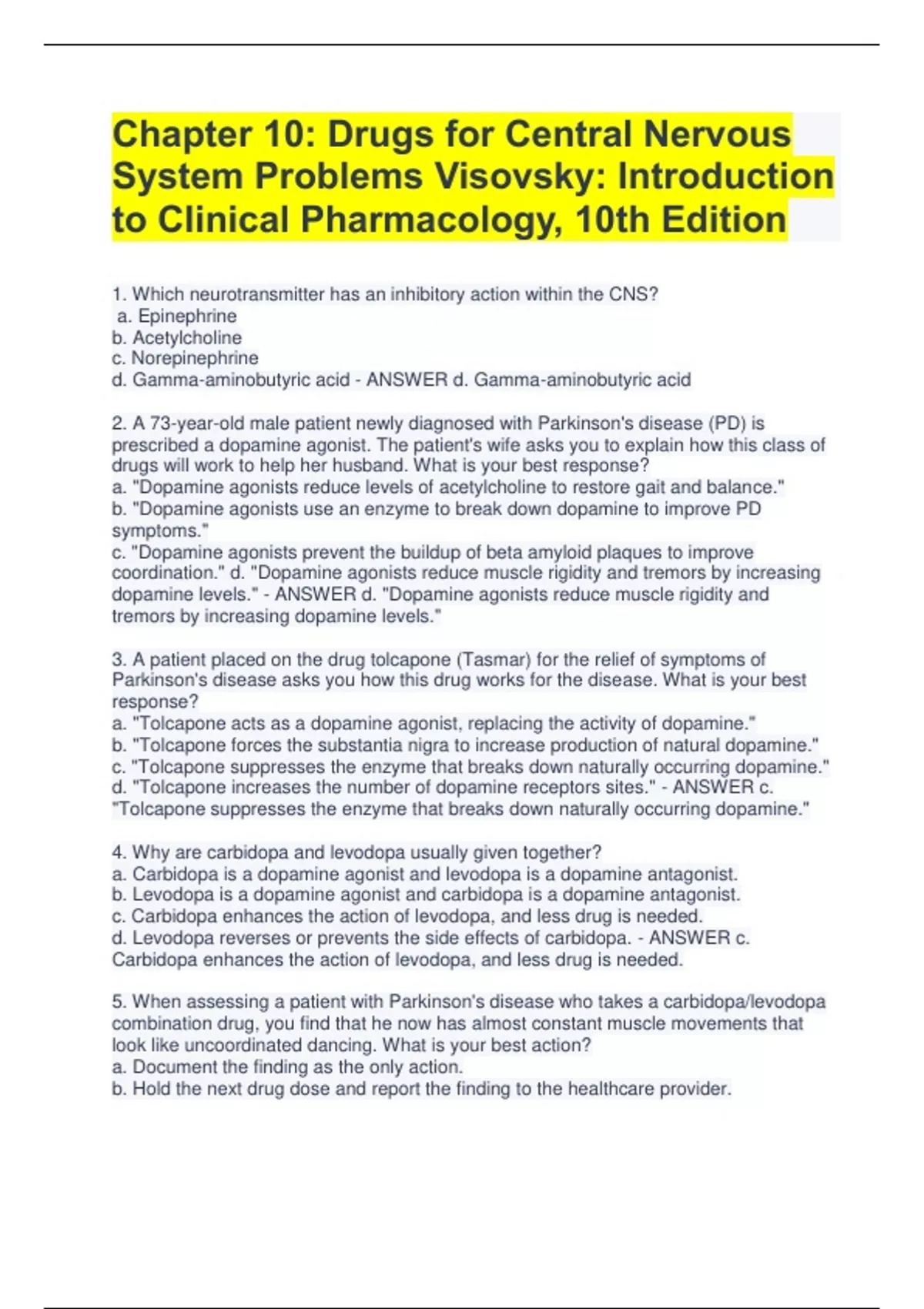 Chapter 10: Drugs for Central Nervous System Problems Visovsky: Introduction to Clinical Pharmacology, 10th Edition 1. Which neurotransmitter has an inhibitory action within the CNS? a. Epinephrine b. Acetylcholine c. Norepinephrine d. Gamma-aminobutyric acid - ANSWER d. Gamma-aminobutyric acid 2. A 73-year-old male patient newly diagnosed with Parkinson's disease (PD) is prescribed a dopamine agonist. The patient's wife asks you to explain how this class of drugs will work to help her husband. What is your best response? a. "Dopamine agonists reduce levels of acetylcholine to restore gait and balance." b. "Dopamine agonists use an enzyme to break down dopamine to improve PD symptoms." c. "Dopamine agonists prevent the buildup of beta amyloid plaques to improve coordination." d. "Dopamine agonists reduce muscle rigidity and tremors by increasing dopamine levels." - ANSWER d. "Dopamine agonists reduce muscle rigidity and tremors by increasing dopamine levels." 3. A patient placed on the drug tolcapone (Tasmar) for the relief of symptoms of Parkinson's disease asks you how this drug works for the disease. What is your best response? a. "Tolcapone acts as a dopamine agonist, replacing the activity of dopamine." b. "Tolcapone forces the substantia nigra to increase production of natural dopamine." c. "Tolcapone suppresses the enzyme that breaks down naturally occurring dopamine." d. "Tolcapone increases the number of dopamine receptors sites." - ANSWER c. "Tolcapone suppresses the enzyme that breaks down naturally occurring dopamine." 4. Why are carbidopa and levodopa usually given together? a. Carbidopa is a dopamine agonist and levodopa is a dopamine antagonist. b. Levodopa is a dopamine agonist and carbidopa is a dopamine antagonist. c. Carbidopa enhances the action of levodopa, and less drug is needed. d. Levodopa reverses or prevents the side effects of carbidopa. - ANSWER c. Carbidopa enhances the action of levodopa, and less drug is needed. 5. When assessing a patient with Parkinson's disease who takes a carbidopa/levodopa combination drug, you find that he now has almost constant muscle movements that look like uncoordinated dancing. What is your best action? a. Document the finding as the only action. b. Hold the next drug dose and report the finding to the healthcare provider.