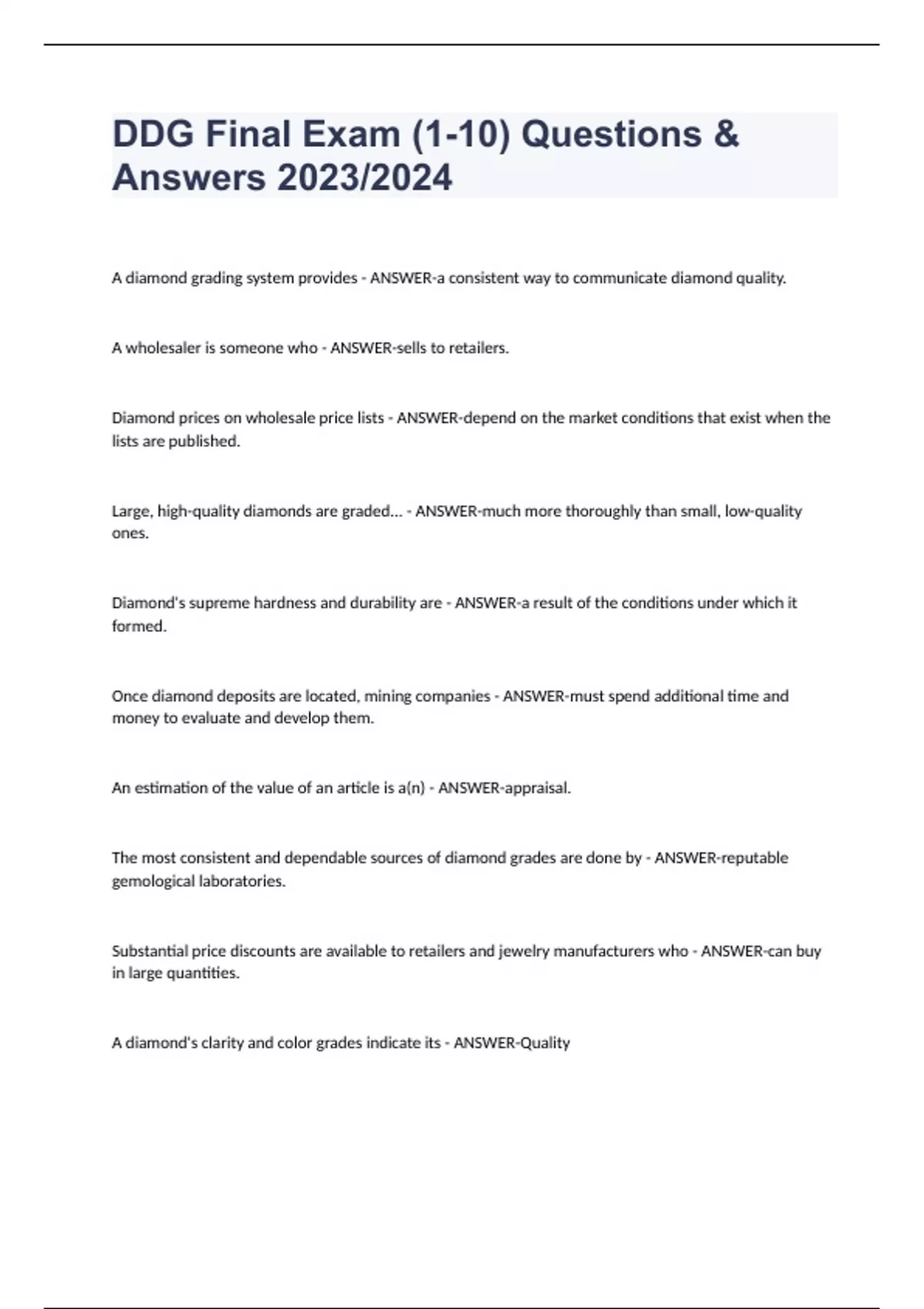 DDG Final Exam (1-10) Questions & Answers 2023/2024 A diamond grading system provides - ANSWER-a consistent way to communicate diamond quality. A wholesaler is someone who - ANSWER-sells to retailers. Diamond prices on wholesale price lists - ANSWER-depend on the market conditions that exist when the lists are published. Large, high-quality diamonds are graded... - ANSWER-much more thoroughly than small, low-quality ones. Diamond's supreme hardness and durability are - ANSWER-a result of the conditions under which it formed. Once diamond deposits are located, mining companies - ANSWER-must spend additional time and money to evaluate and develop them. An estimation of the value of an article is a(n) - ANSWER-appraisal. The most consistent and dependable sources of diamond grades are done by - ANSWER-reputable gemological laboratories. Substantial price discounts are available to retailers and jewelry manufacturers who - ANSWER-can buy in large quantities. A diamond's clarity and color grades indicate its - ANSWER-Quality