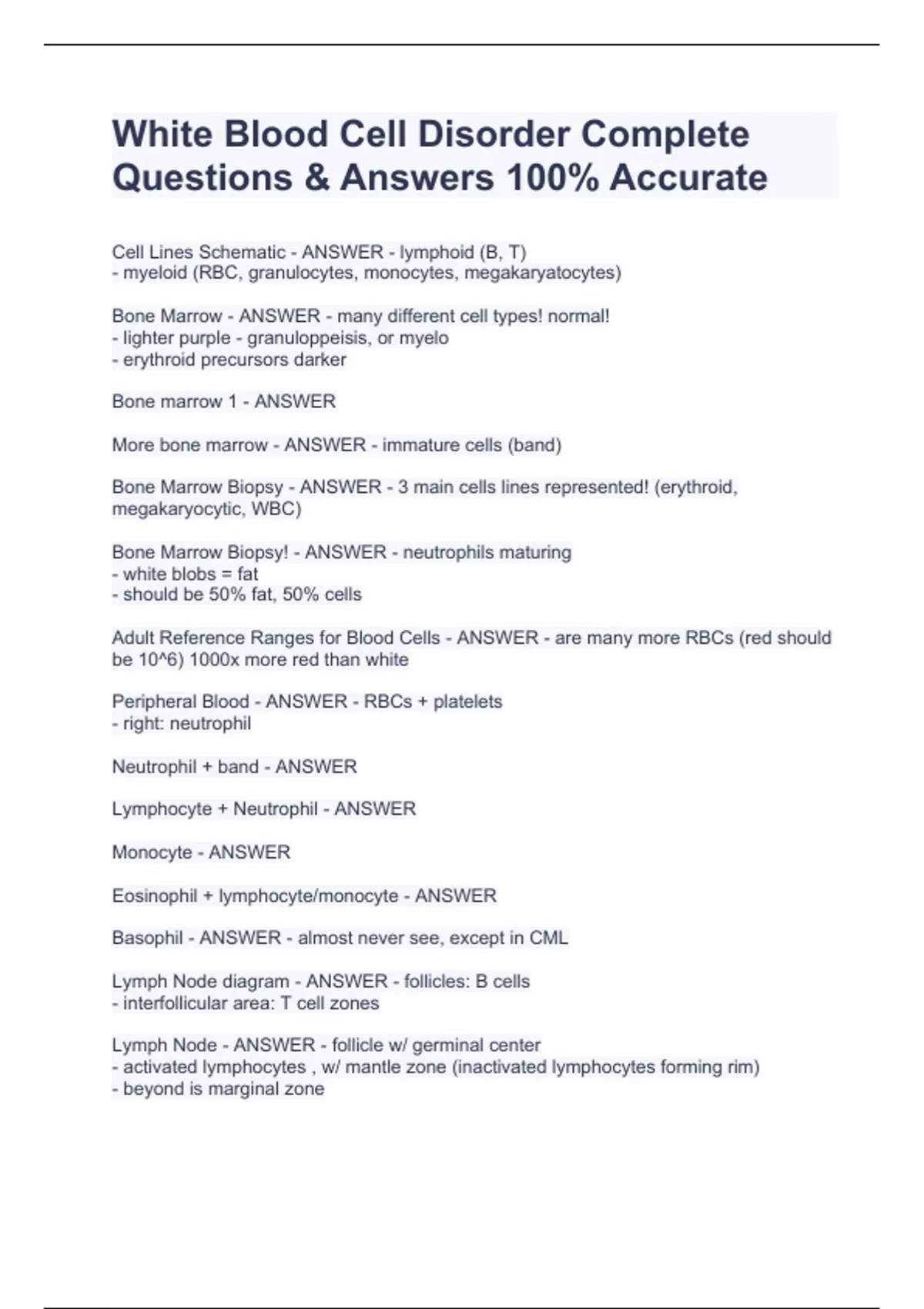 White Blood Cell Disorder Complete Questions & Answers 100% AccurateWhite Blood Cell Disorder Complete Questions & Answers 100% AccurateWhite Blood Cell Disorder Complete Questions & Answers 100% AccurateWhite Blood Cell Disorder Complete Questions & Answers 100% AccurateCell Lines Schematic - ANSWER - lymphoid (B, T) - myeloid (RBC, granulocytes, monocytes, megakaryatocytes) Bone Marrow - ANSWER - many different cell types! normal! - lighter purple - granuloppeisis, or myelo - erythroid precursors darker Bone marrow 1 - ANSWER More bone marrow - ANSWER - immature cells (band) Bone Marrow Biopsy - ANSWER - 3 main cells lines represented! (erythroid, megakaryocytic, WBC) Bone Marrow Biopsy! - ANSWER - neutrophils maturing - white blobs = fat - should be 50% fat, 50% cells Adult Reference Ranges for Blood Cells - ANSWER - are many more RBCs (red should be 10^6) 1000x more red than white Peripheral Blood - ANSWER - RBCs + platelets - right: neutrophil Neutrophil + band - ANSWER Lymphocyte + Neutrophil - ANSWER Monocyte - ANSWER