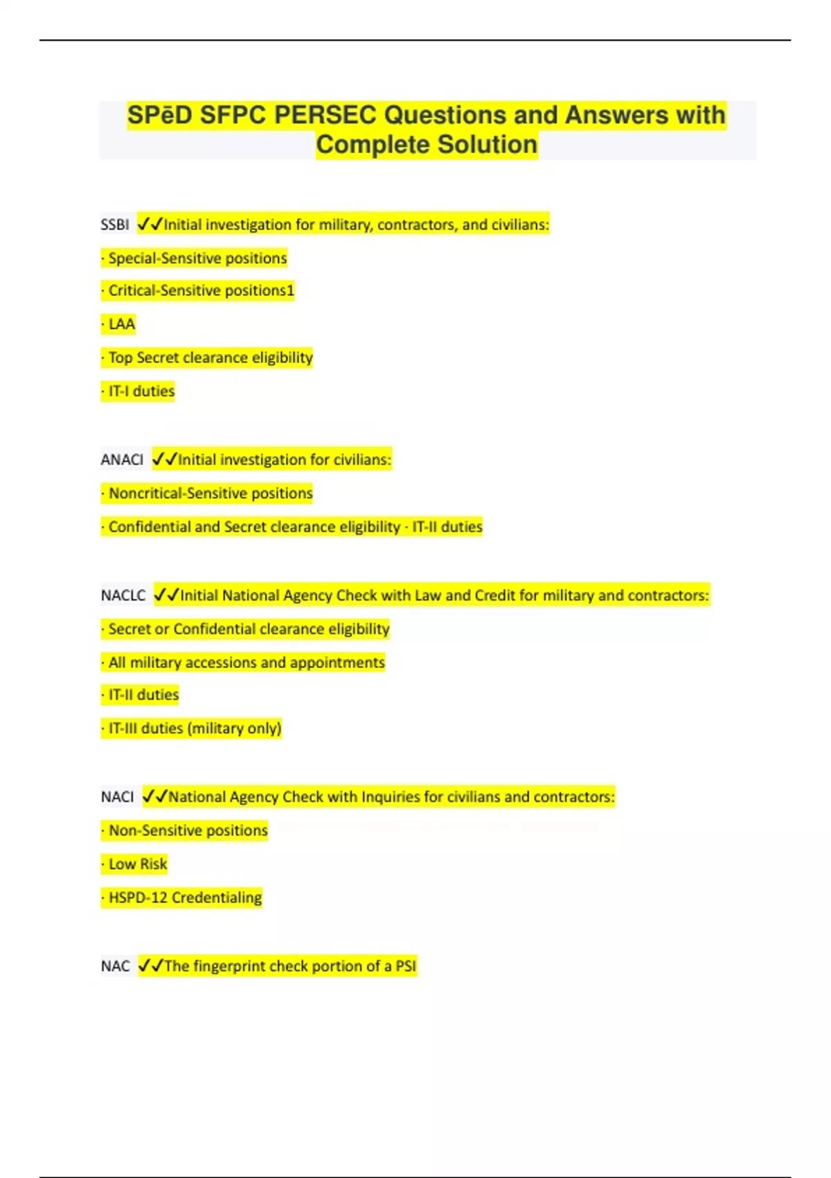 SPēD SFPC PERSEC Questions and Answers with Complete Solution SSBI Initial investigation for military, contractors, and civilians: · Special-Sensitive positions · Critical-Sensitive positions1 · LAA · Top Secret clearance eligibility · IT-I duties ANACI Initial investigation for civilians: · Noncritical-Sensitive positions · Confidential and Secret clearance eligibility · IT-II duties NACLC Initial National Agency Check with Law and Credit for military and contractors: · Secret or Confidential clearance eligibility · All military accessions and appointments · IT-II duties · IT-III duties (military only) NACI National Agency Check with Inquiries for civilians and contractors: · Non-Sensitive positions · Low Risk · HSPD-12 Credentialing NAC The fingerprint check portion of a PSI