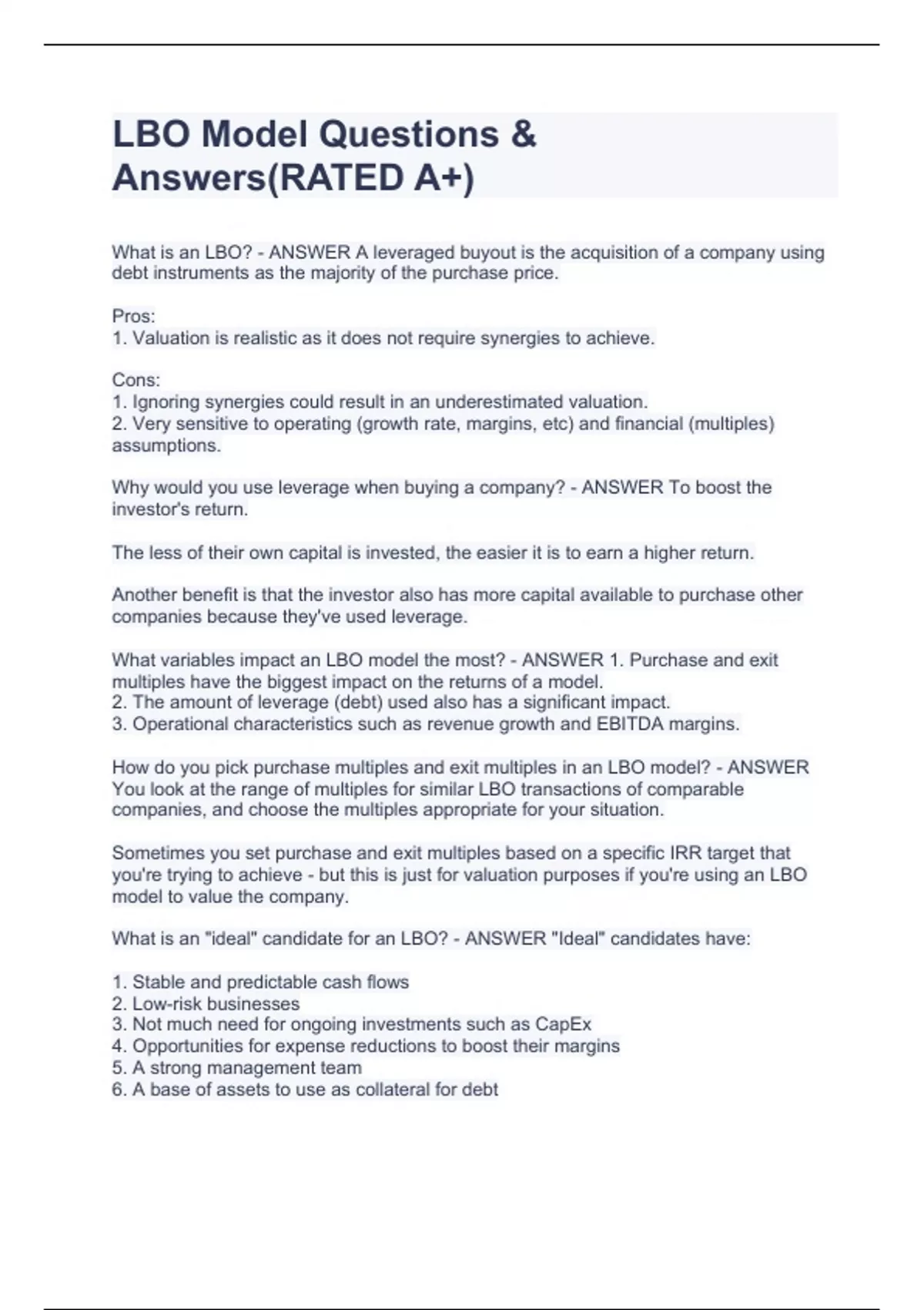 LBO Model Questions & Answers(RATED A+)