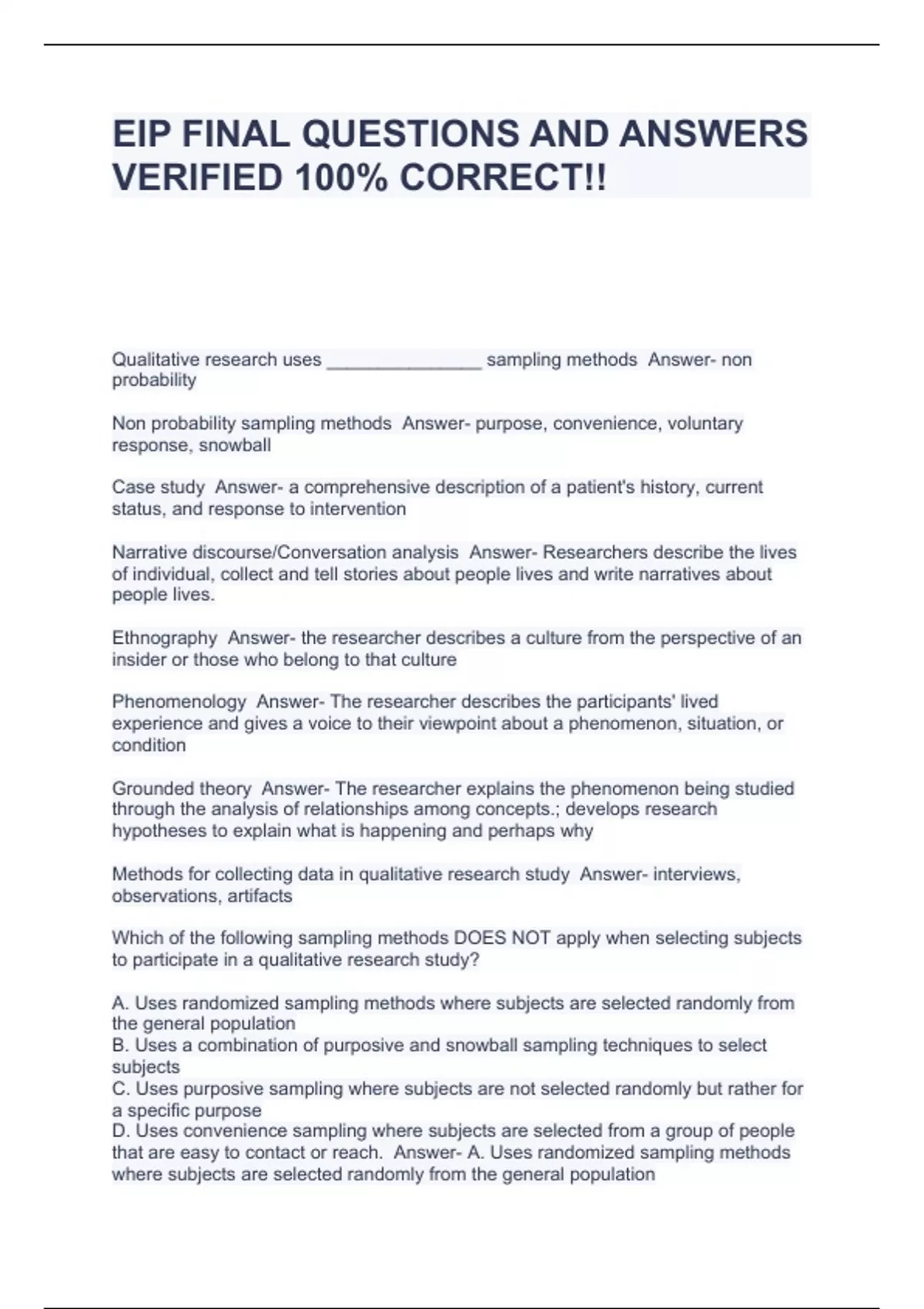 EIP FINAL QUESTIONS AND ANSWERS VERIFIED 100% CORRECT!!