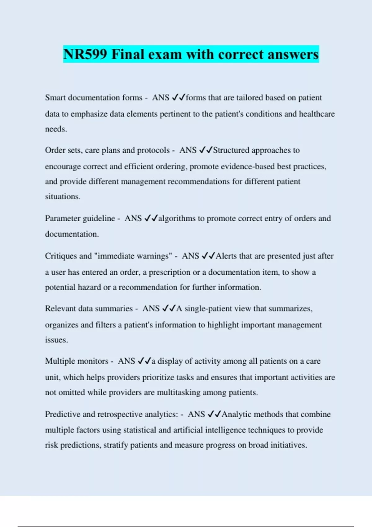 NR599 Final exam with correct answers Smart documentation forms - ANS ️️ forms that are tailored based on patient data to emphasize data elements pertinent to the patient's conditions and healthcare needs. Order sets, care plans and protocols - ANS ️️ Structured approaches to encourage correct and efficient ordering, promote evidence-based best practices, and provide different management recommendations for different patient situations. Parameter guideline - ANS ️️ algorithms to promote correct entry of orders and documentation. Critiques and "immediate warnings" - ANS ️️ Alerts that are presented just after a user has entered an order, a prescription or a documentation item, to show a potential hazard or a recommendation for further information. Relevant data summaries - ANS ️️ A single-patient view that summarizes, organizes and filters a patient's information to highlight important management issues. Multiple monitors - ANS ️️ a display of activity among all patients on a care unit, which helps providers prioritize tasks and ensures that important activities are not omitted while providers are multitasking among patients. Predictive and retrospective analytics: - ANS ️️ Analytic methods that combine multiple factors using statistical and artificial intelligence techniques to provide risk predictions, stratify patients and measure progress on broad initiatives
