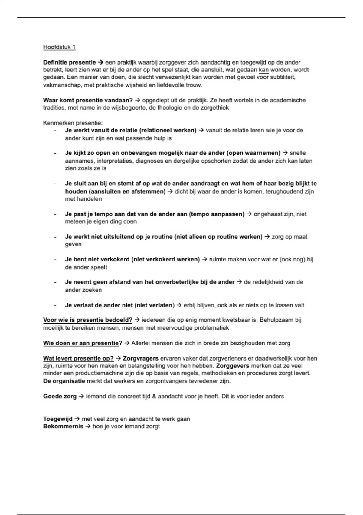 Definitie presentie → een praktijk waarbij zorggever zich aandachtig en toegewijd op de ander