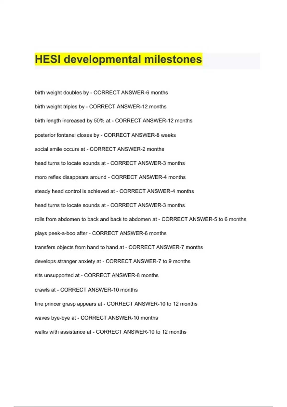 birth weight doubles by - CORRECT ANSWER-6 months birth weight triples by - CORRECT ANSWER-12 months birth length increased by 50% at - CORRECT ANSWER-12 months posterior fontanel closes by - CORRECT ANSWER-8 weeks social smile occurs at - CORRECT ANSWER-2 months head turns to locate sounds at - CORRECT ANSWER-3 months moro reflex disappears around - CORRECT ANSWER-4 months steady head control is achieved at - CORRECT ANSWER-4 months HESI developmental milestones