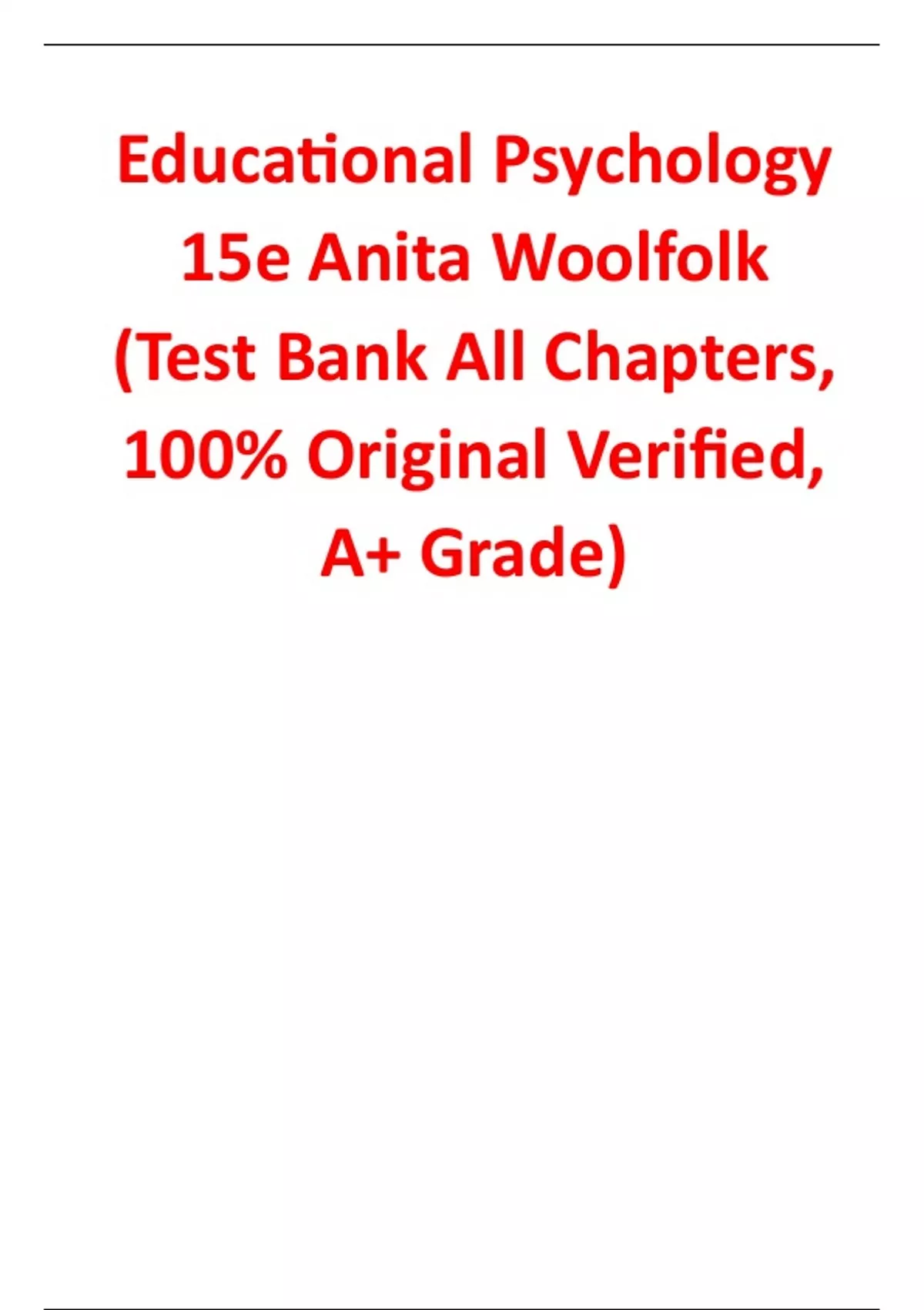 Test Bank For Educational Psychology 15th Edition By Anita Woolfolk (All Chapters, 100% Original Verified, A+ Grade) Test Bank For Educational Psychology 15e By Anita Woolfolk (All Chapters, 100% Original Verified, A+ Grade)
