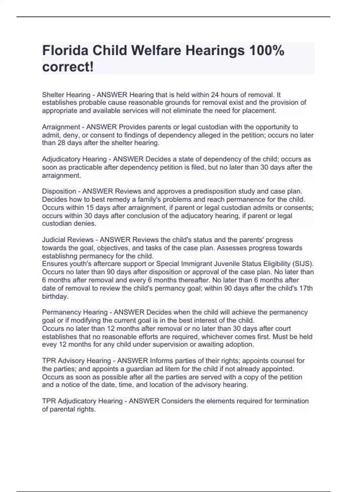 Florida Child Welfare Hearings 100% correct!