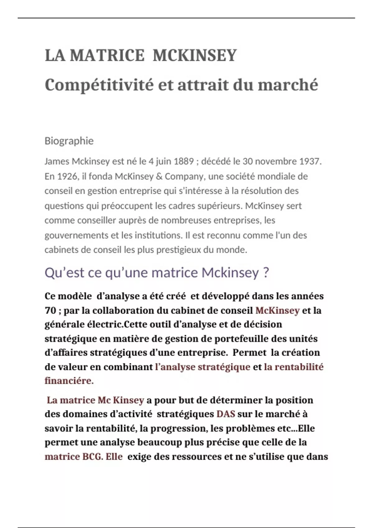 Résumé LA MATRICE MCKINSEY Compétitivité et attrait du marché