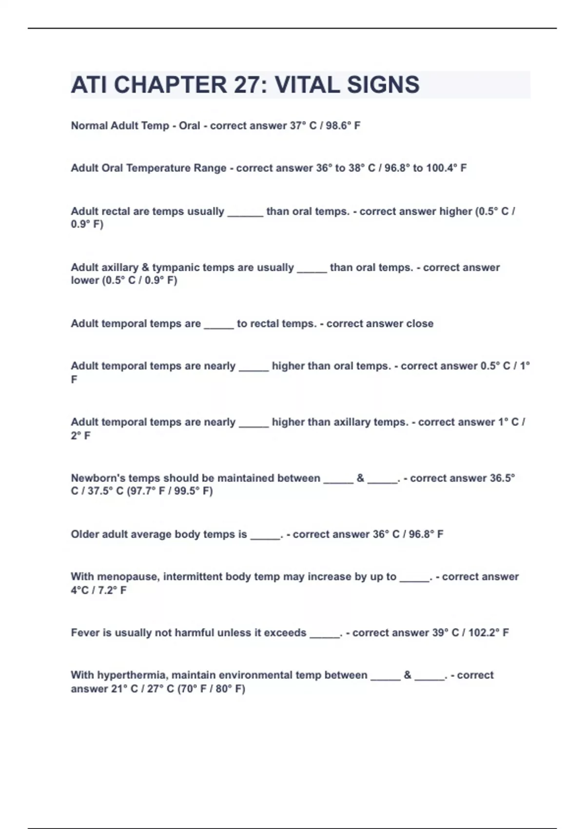 ATI CHAPTER 27: VITAL SIGNS Normal Adult Temp - Oral - correct answer 37° C / 98.6° F Adult Oral Temperature Range - correct answer 36° to 38° C / 96.8° to 100.4° F Adult rectal are temps usually ______ than oral temps. - correct answer higher (0.5° C / 0.9° F) Adult axillary & tympanic temps are usually _____ than oral temps. - correct answer lower (0.5° C / 0.9° F) Adult temporal temps are _____ to rectal temps. - correct answer close Adult temporal temps are nearly _____ higher than oral temps. - correct answer 0.5° C / 1° F Adult temporal temps are nearly _____ higher than axillary temps. - correct answer 1° C / 2° F Newborn's temps should be maintained between _____ & _____. - correct answer 36.5° C / 37.5° C (97.7° F / 99.5° F) Older adult average body temps is _____. - correct answer 36° C / 96.8° F With menopause, intermittent body temp may increase by up to _____. - correct answer 4°C / 7.2° F