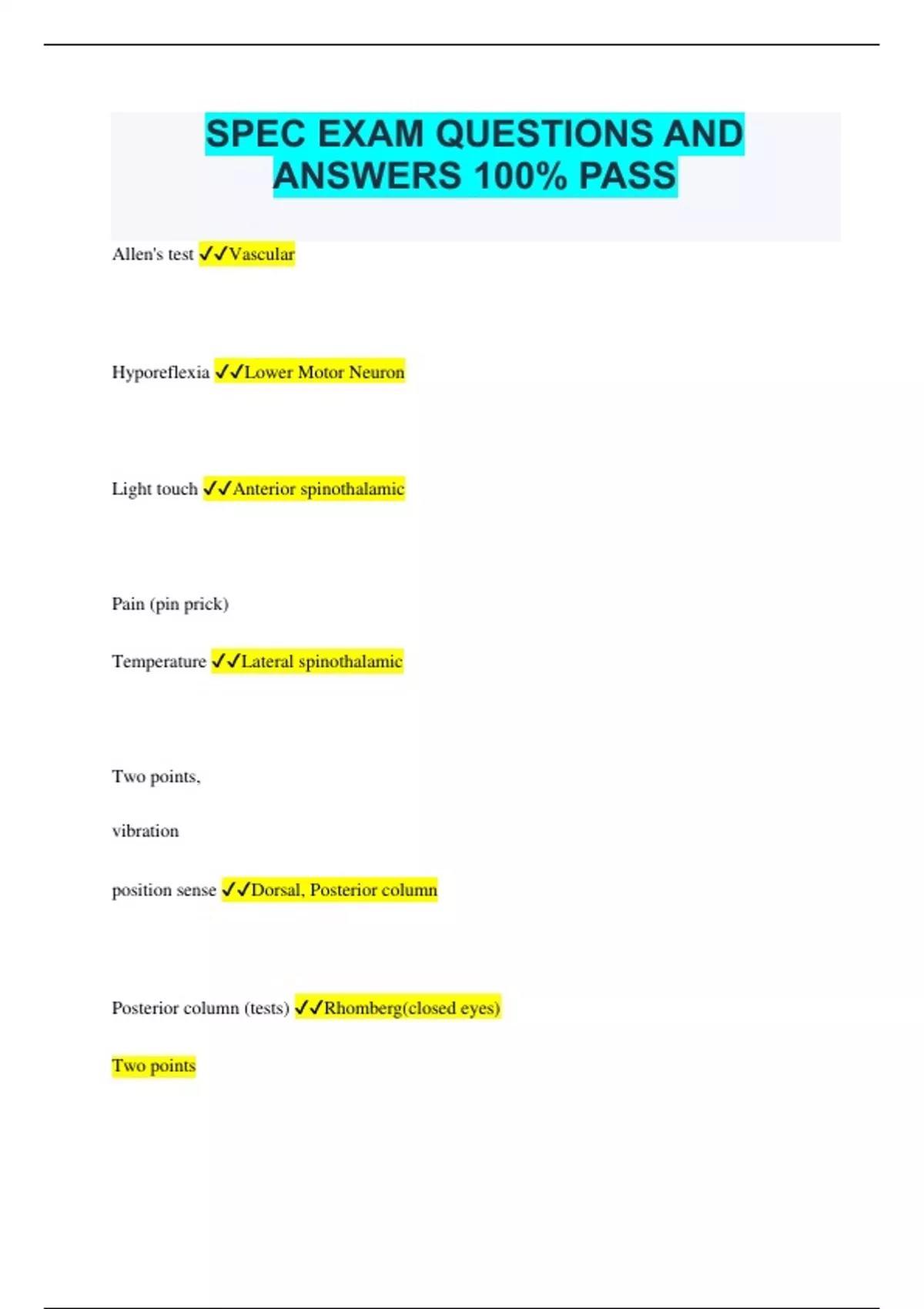 SPEC EXAM QUESTIONS AND ANSWERS 100% PASS Allen's test Vascular Hyporeflexia Lower Motor Neuron Light touch Anterior spinothalamic Pain (pin prick) Temperature Lateral spinothalamic Two points, vibration position sense Dorsal, Posterior column Posterior column (tests) Rhomberg(closed eyes) Two points Stereognosis Graphesthesia Upper motor neuron lesions Hoffman's + flick fingers Thumb adducts Upper motor neuron lesions Babinski + Extension of big toe (6 month old) Cerebellar lesions (proprioception) Tandem Walk + Rhomberg test (falls with eyes closed) Point to point Heel to shin Toe walk L5 - S1 Heel walk L4 Allen's test Occlusion of arteries DTR Patella L4 DTR Medial Hamstring L5 DTR Achilles S1 DTR biceps C5 DTR Brachioradialus C6 DTR Triceps C7 DTR 2 normal Dermatomes Nipple T4 Dermatomes Umbilicus T10 Dermatomes Iliac crest T12 Muscles testing 5 normal Muscles testing