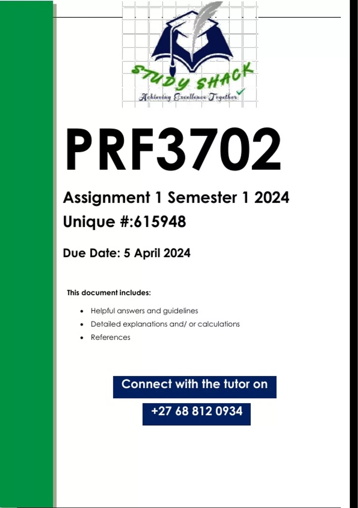 This document contains workings, explanations and solutions to the PRF3702 Assignment 1 (QUALITY ANSWERS) Semester 1 2024. For assistance call or us on 0.6.8..8.1.2..0.9.3.4..... QUESTION 1 1. Explain in your own words, in one paragraph, what the following concepts mean. 1.1 Principle-based management. (10) 1.2 Ethical and accountable conduct in the workplace. (10) QUESTION 2 2. Base your discussion on Lesson 1 Principle-based management in the workplace context, and Lesson 2 the workplace in terms of ethics and accountability. 2.1 The International Organisation for Standardisation (ISO) states that there are eight quality management principles. Discuss any one of the eight quality management principles. (5) 2.2 List the seven drivers that compel police personnel to do quality work resulting from their commitment to fair treatment. (5) 2.3 Select any one of the seven drivers that compel police personnel to do quality work and motivate why you selected it. (5) 2.4 A good leader in a policing context should have certain personal qualities. List eight leadership qualities. (5) 2.5 Select any one of the eight leadership qualities that makes a leader at a police station exemplary and motivate why you selected it. (5) 2.6 Performance management system is based on three principles. List these principles. (5) 3. Reference list