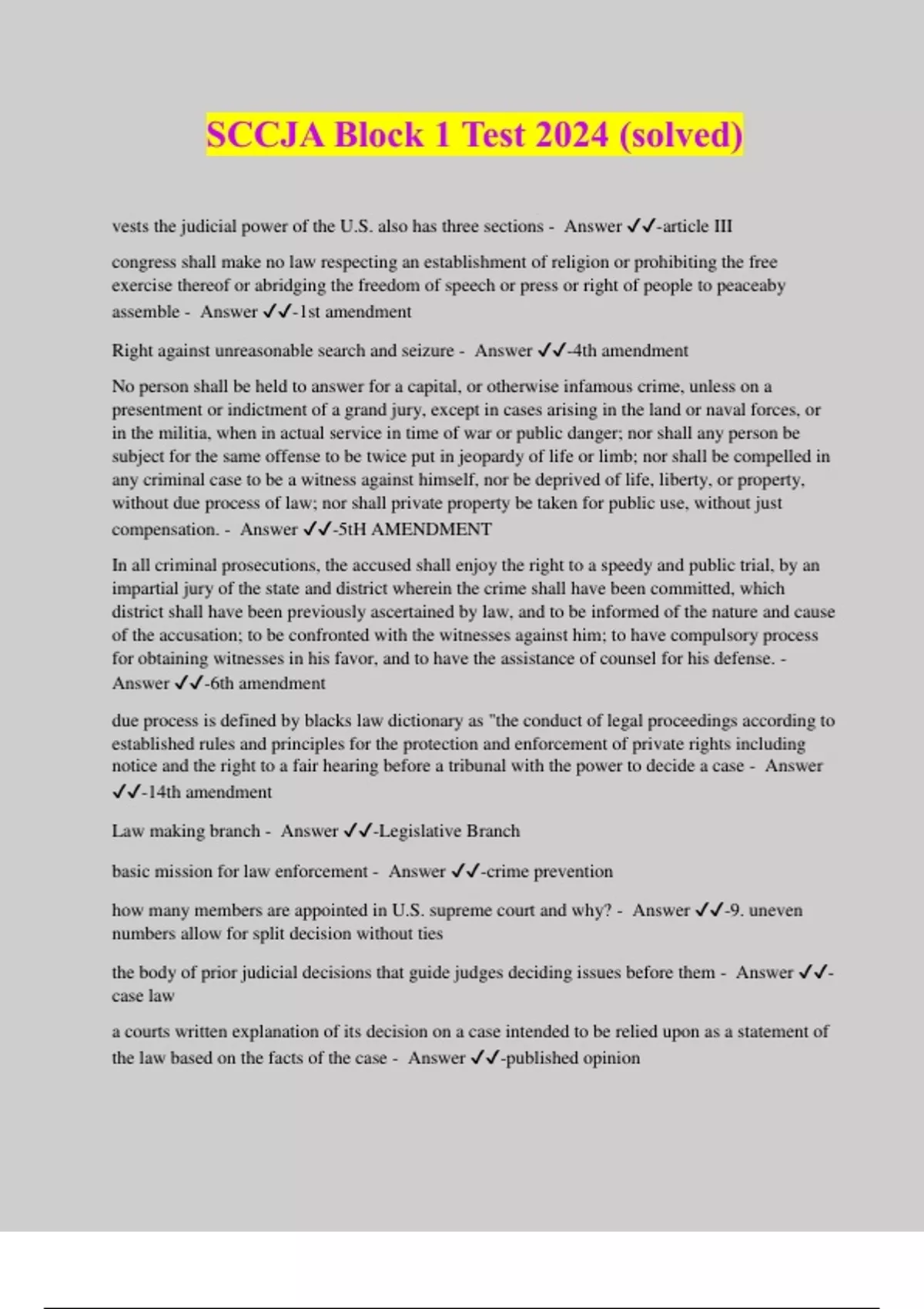 SCCJA Block 1 Test 2024 (solved) vests the judicial power of the U.S. also has three sections - Answer ️️ -article III congress shall make no law respecting an establishment of religion or prohibiting the free exercise thereof or abridging the freedom of speech or press or right of people to peaceaby assemble - Answer ️️ -1st amendment Right against unreasonable search and seizure - Answer ️️ -4th amendment No person shall be held to answer for a capital, or otherwise infamous crime, unless on a presentment or indictment of a grand jury, except in cases arising in the land or naval forces, or in the militia, when in actual service in time of war or public danger; nor shall any person be subject for the same offense to be twice put in jeopardy of life or limb; nor shall be compelled in any criminal case to be a witness against himself, nor be deprived of life, liberty, or property, without due process of law; nor shall private property be taken for public use, without just compensation. - Answer ️️ -5tH AMENDMENT In all criminal prosecutions, the accused shall enjoy the right to a speedy and public trial, by an impartial jury of the state and district wherein the crime shall have been committed, which district shall have been previously ascertained by law, and to be informed of the nature and cause of the accusation; to be confronted with the witnesses against him; to have compulsory process for obtaining witnesses in his favor, and to have the assistance of counsel for his defense. - Answer ️️ -6th amendment due process is defined by blacks law dictionary as "the conduct of legal proceedings according to established rules and principles for the protection and enforcement of private rights including notice and the right to a fair hearing before a tribunal with the power to decide a case - Answer ️️ -14th amendment Law making branch - Answer ️️ -Legislative Branch basic mission for law enforcement - Answer ️️ -crime prevention how many members are appointed in U.S. supreme court and why? - Answer ️️ -9. uneven numbers allow for split decision without ties the body of prior judicial decisions that guide judges deciding issues before them - Answer ️️ - case law a courts written explanation of its decision on a case intended to be relied upon as a statement of the law based on the facts of the case - Answer ️️ -published opinion an opinion that the court has designated as unfit for publication. an opinion may be placed on the courts web page but will be classified as "unpublished" - Answer ️️ -unpub