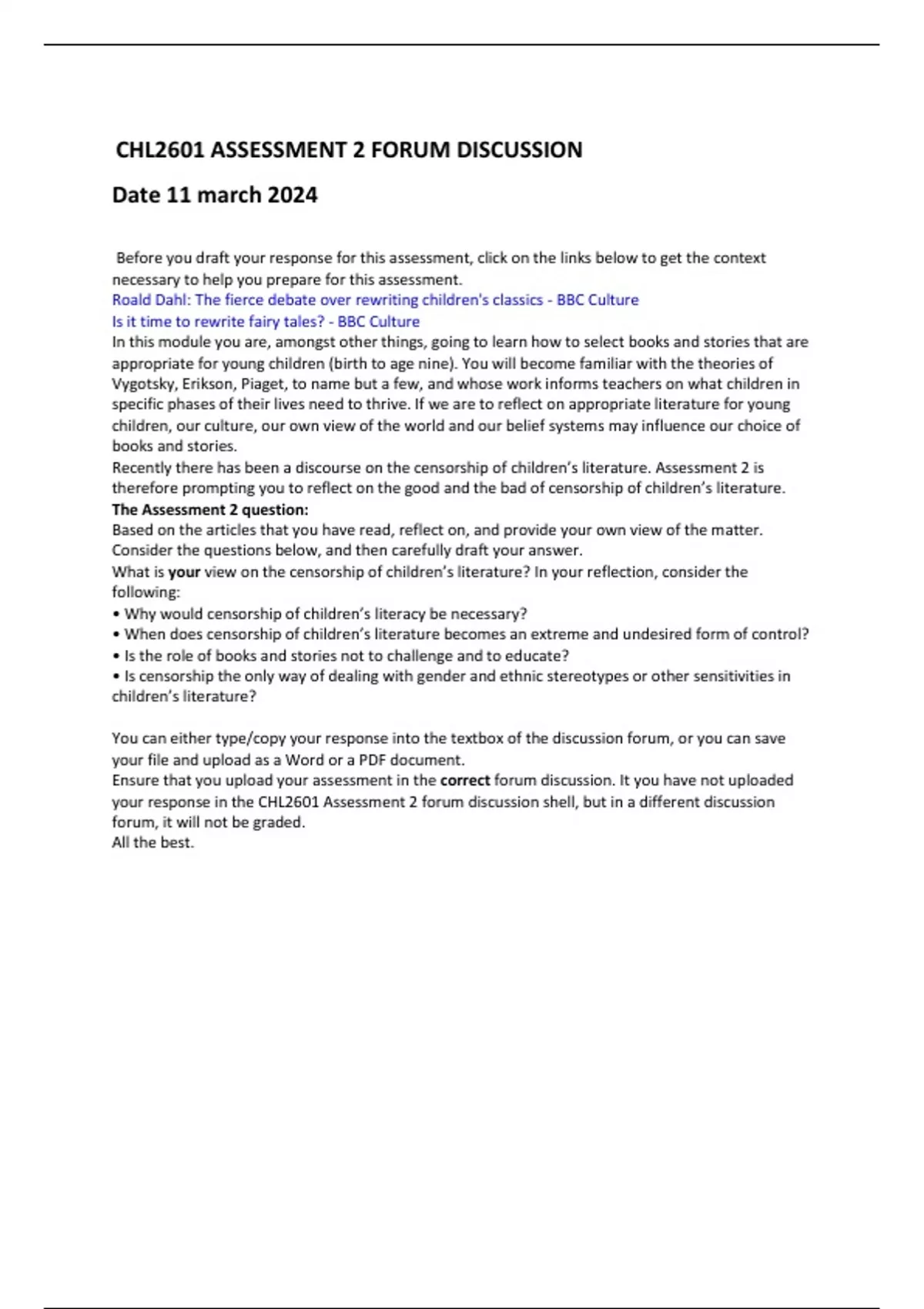 Recently there has been a discourse on the censorship of children’s literature. Assessment 2 is