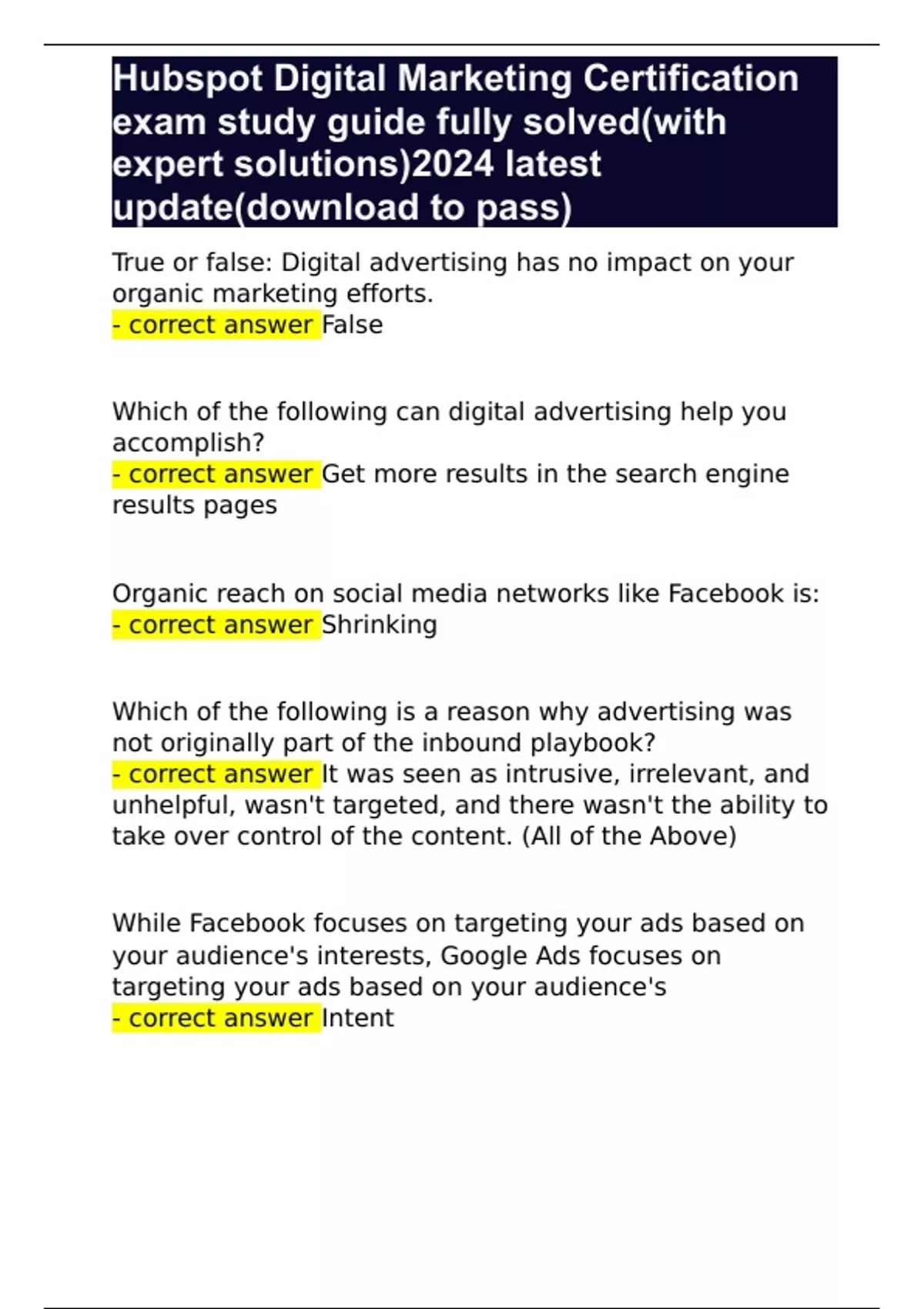 Hubspot Digital Marketing Certification exam study guide fully solved(with expert solutions)2024 latest update(download to pass)