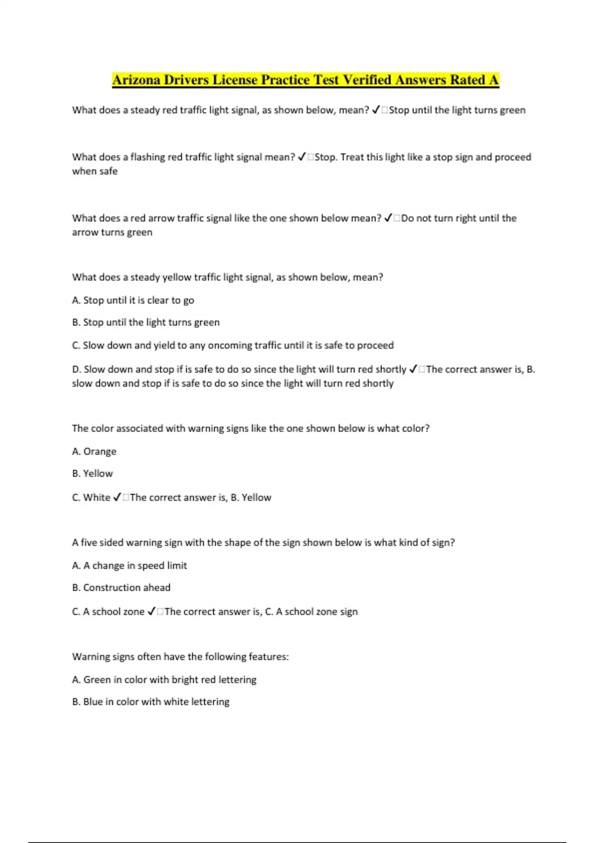 Arizona Drivers License Practice Test Verified Answers Rated A What does a steady red traffic light signal, as shown below, mean? ️Stop until the light turns green What does a flashing red traffic light signal mean? ️Stop. Treat this light like a stop sign and proceed when safe What does a red arrow traffic signal like the one shown below mean? ️Do not turn right until the arrow turns green What does a steady yellow traffic light signal, as shown below, mean? A. Stop until it is clear to go B. Stop until the light turns green C. Slow down and yield to any oncoming traffic until it is safe to proceed D. Slow down and stop if is safe to do so since the light will turn red shortly ️The correct answer is, B. slow down and stop if is safe to do so since the light will turn red shortly The color associated with warning signs like the one shown below is what color? A. Orange B. Yellow C. White ️The correct answer is, B. Yellow A five sided warning sign with the shape of the sign shown below is what kind of sign? A. A change in speed limit B. Construction ahead C. A school zone ️The correct answer is, C. A school zone sign Warning signs often have the following features: A. Green in color with bright red lettering B. Blue in color with white lettering C.Yellow with black lettering ️The correct answer is, C. Yellow in color with black lettering Which of the following is not a warning sign: A. Deer Crossing B. Exit Ahead C. 2 Way Traffic ️The correct answer is, B. Exit Ahead Identify the sign shown below A. Right Lane Ends Sign B. No U-Turns Sign C. Merge Sign ️The correct answer is, C. Merge sign Identify the sign shown below A. No Right Turns Sign B. Right lane Ends Sign C. Intersection Sign ️The correct answer is, B. Right lane ends sign Identify the sign shown below A. Two Way Traffic Ahead B. Intersection Sign C. No Right Turns Sign D. Crosswalk ️The correct answer is, A. Two Way Traffic Ahead sign Identify the sign shown below A. Crosswalk Ahead B. Intersection Sign C. Church Crossing Sign ️The correct answer is, B. Intersection sign True or False? Regulatory Signs often feature a red circle with a diagonal through the middle. ️True, a No U-Turn sign is an example When a regulatory sign prohibits a certain action it will contain: A. A green circle with the word NO in it B. A yellow circle with an x through it C. A red circle with a diagonal slash through it ️The correct answer is, c. A red circle with a diagonal slash through it Identify the sign shown below. ️A no u-turn sign Identify the sign shown below. ️A no right-turn sign A speed limit sign usually tells you: A. the maximum speed that you should travel in ideal conditions B. The speed that is safe and prudent C. The speed that you should travel at in less than ideal conditions ️The correct answer is, a. the maximum speed that you should travel in ideal conditions True or False? Some high speed roads have minimum speed limits? ️True - Interstates will have a 45 MPH minimum True or False? In less than ideal conditions you can still travel at the speed limit if you think you can handle the vehicle safely. ️False. In less than ideal conditions you should reduce your speed accordingly The speed limit in a school zone when children are present is usually what speed? A. 35 mph B. 15 mph C. 25 mph ️The correct answer is, B. 15 mph True or False? Lane control signs often use arrows to tell you which direction you can turn from a certain lane. ️True The sign shown below is a: A. Guide Sign B. Warning Sign C. Regulatory Sign ️The correct answer is, A. Guide Sign True or False? Lane Control signs are sometimes painted on the roads. ️True True or False? Lane Control signs never hang over the lane of travel. ️False, sometimes they do A no passing zone sign is usually located on which side of the road? A) Left side of the road B) Right side of the road ️The correct answer is, A. The left side of the road Identify the shape below that is the shape of a No Passing Zone sign. ️Pennant True or False? A reflective orange triangle indicates construction ahead? ️False. A reflective orange triangle is found on the backs of slow moving vehicles. What is used to indicate slow moving vehicles? A. A red circle B. An Orange Diamond C. And orange upward pointing triangle ️The correct answer is, C. An orange upward pointing tr