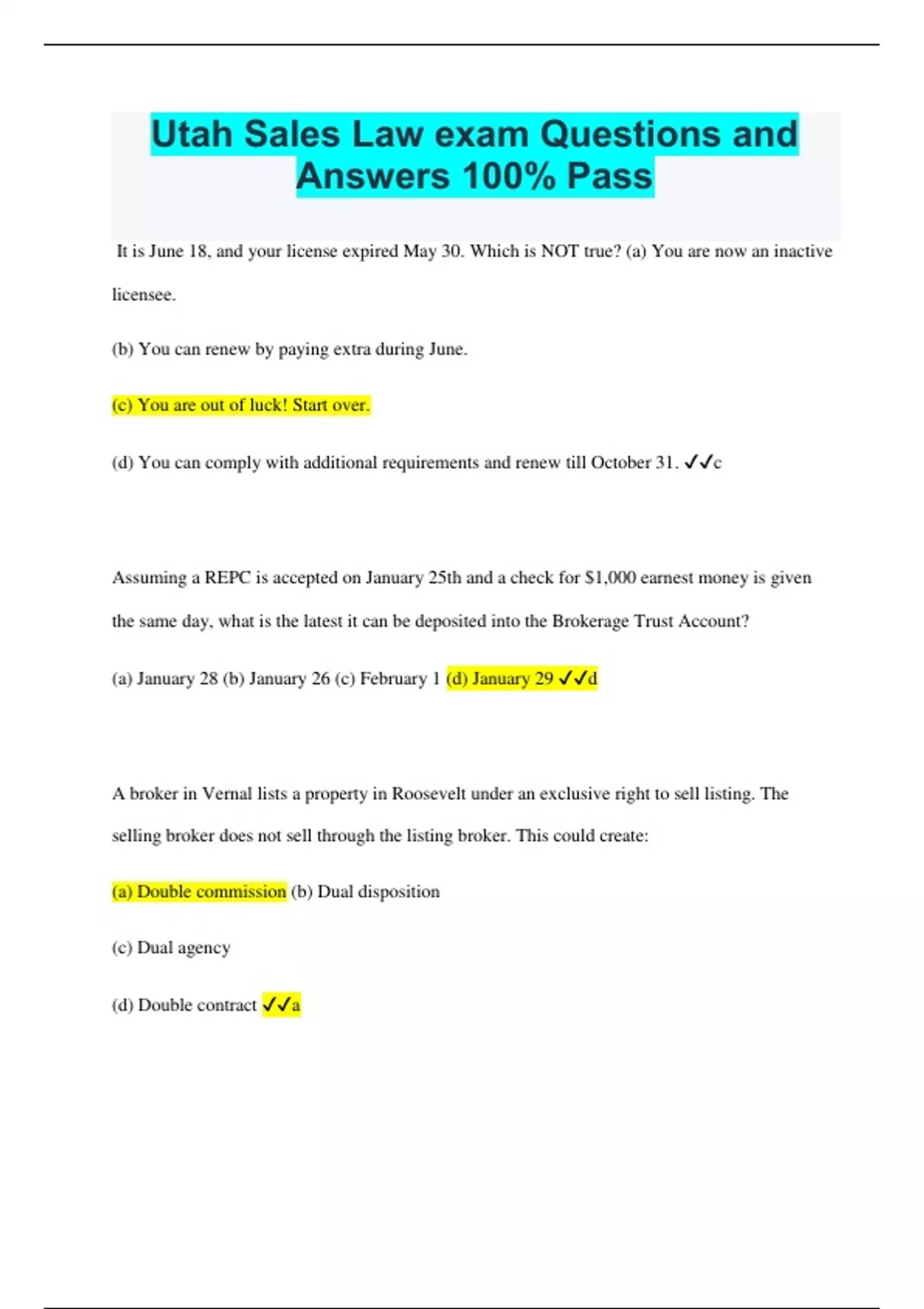 Utah Sales Law exam Questions and Answers 100% Pass It is June 18, and your license expired May 30. Which is NOT true? (a) You are now an inactive licensee. (b) You can renew by paying extra during June. (c) You are out of luck! Start over. (d) You can comply with additional requirements and renew till October 31. c Assuming a REPC is accepted on January 25th and a check for $1,000 earnest money is given the same day, what is the latest it can be deposited into the Brokerage Trust Account? (a) January 28 (b) January 26 (c) February 1 (d) January 29 d A broker in Vernal lists a property in Roosevelt under an exclusive right to sell listing. The selling broker does not sell through the listing broker. This could create: (a) Double commission (b) Dual disposition (c) Dual agency (d) Double contract a A person who owned a condominium might own any of the properties described below EXCEPT: (a) A medical/dental building (b) A unit in a light industrial complex (c) A single family dwelling (d) A nine-hole golf course d When the Division thinks a licensee is violating Utah Real Estate Law, before the hearing they may: (a) Issue a "writ of attachment." (b) Freeze the trust account to protect against embezzlement. (c) Suspend the license of the individual involved in the questionable activities. (d) Issue a "Cease and Desist Order." d 15. You list a home that has an old well on it. The seller knows nothing about it. It is not being used now, but the seller doesn't know who has the water rights. Where would you check to find out. (a) Division of Water Rights. (b) Water Usage & Appropriations Commission (c) State Water Commissioner. (d) Utah Real Estate Division, Water Rights Section. a If a principal broker dies, and it is a sole proprietorship, what should be done with the records of the company? (a) A receiver will be appointed by the Division to handle the records. (b) The Division should be notified as to where the records will be stored. (c) They must be transferred to the Division. (d) The administrator of the broker's estate must keep the records. b Under the Division Rules, which of the following is NOT correct? (a) When requested by the client, the agent must give them copies of documents from both sides of the transaction. (b) Licensees shall keep their broker informed regarding their transactions. (c) Net listings shall not be taken by a licensee. (d) A principal broker cannot keep part of the earnest money unless both parties agree. a Which of the following is NOT required for an unlicensed auctioneer to conduct an auction of real property? (a) A principal broker is present at the auction. (b) The Real Estate Purchase Agreement is used and filled out by a licensee. (c) The earnest money is deposited in the broker's trust account. (d) A principal broker has reviewed and initialed all