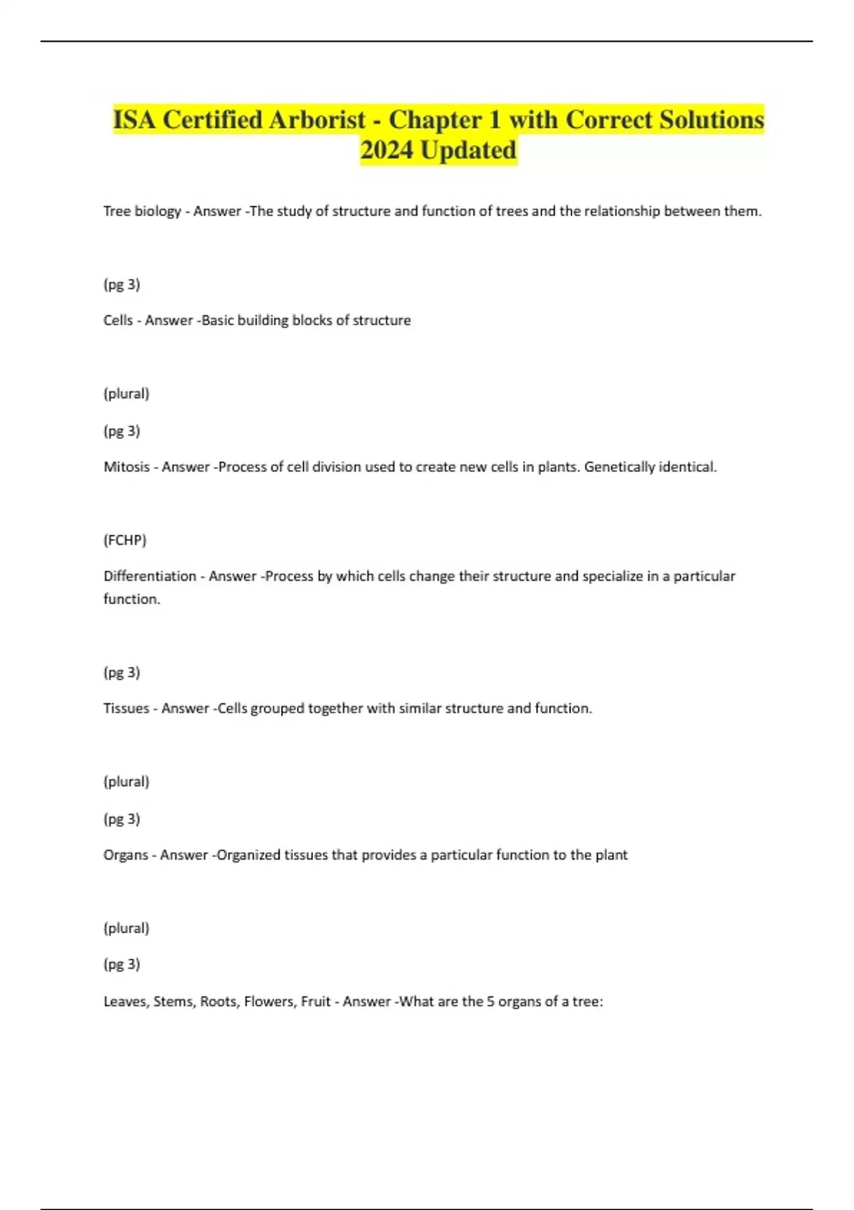 ISA Certified Arborist - Chapter 1 with Correct Solutions 2024 Updated Tree biology - Answer -The study of structure and function of trees and the relationship between them. (pg 3) Cells - Answer -Basic building blocks of structure (plural) (pg 3) Mitosis - Answer -Process of cell division used to create new cells in plants. Genetically identical. (FCHP) Differentiation - Answer -Process by which cells change their structure and specialize in a particular function. (pg 3) Tissues - Answer -Cells grouped together with similar structure and function. (plural) (pg 3) Organs - Answer -Organized tissues that provides a particular function to the plant (plural) (pg 3) Leaves, Stems, Roots, Flowers, Fruit - Answer -What are the 5 organs of a tree:Format answer in the form of: ______, _____, _____, _______, _____ (plural) (pg 3) Organs, Tissues, Specialized Cells, Differentiation, Mitosis - Answer -Trees are composed of ______ Organs are made up of _______ Tissues are groups of ___________ ____ Specialized Cells are created via _______________ Cells undergo Differentiation after they are created by the process of _______ Format answer in the form of: ______, _______, ___________ ____, _______________, _______ (plural) (pg 3, FCHP) Primary Growth - Answer -The type of growth occurring from Apical Meristems (pg 3) Primary Growth - Answer -The type of growth that results in