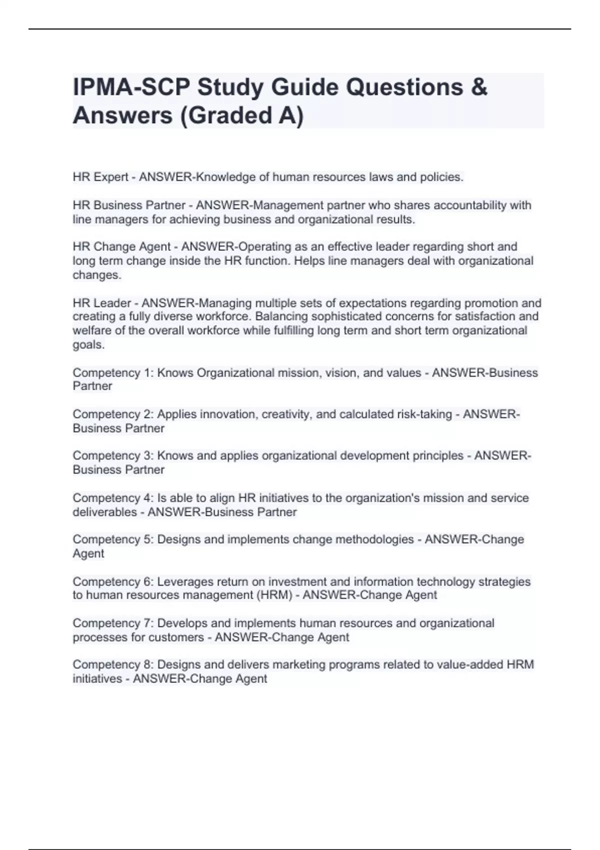 IPMA-SCP Study Guide Questions & Answers (Graded A)IPMA-SCP Study Guide Questions & Answers (Graded A)IPMA-SCP Study Guide Questions & Answers (Graded A)IPMA-SCP Study Guide Questions & Answers (Graded A) HR Expert - ANSWER-Knowledge of human resources laws and policies. HR Business Partner - ANSWER-Management partner who shares accountability with line managers for achieving business and organizational results. HR Change Agent - ANSWER-Operating as an effective leader regarding short and long term change inside the HR function. Helps line managers deal with organizational changes. HR Leader - ANSWER-Managing multiple sets of expectations regarding promotion and creating a fully diverse workforce. Balancing sophisticated concerns for satisfaction and welfare of the overall workforce while fulfilling long term and short term organizational