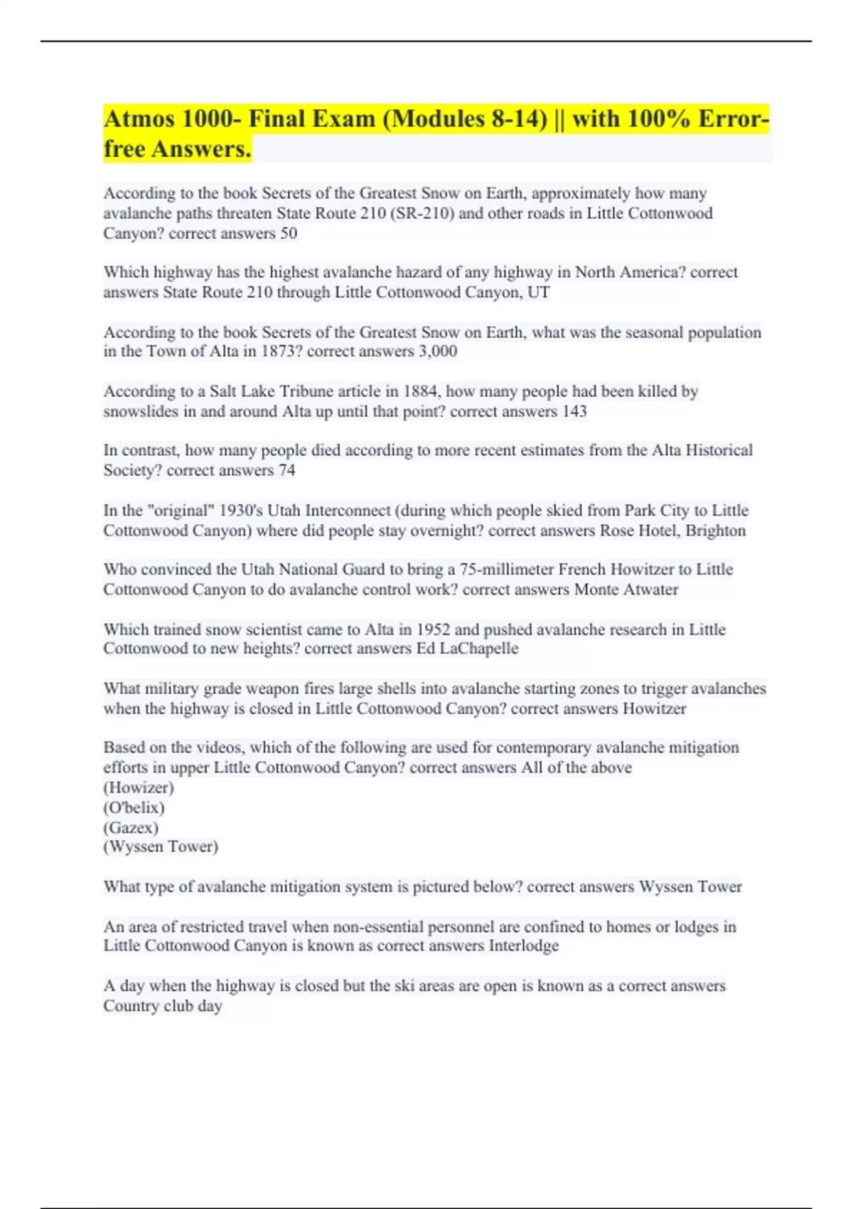 According to the book Secrets of the Greatest Snow on Earth, approximately how many avalanche paths threaten State Route 210 (SR-210) and other roads in Little Cottonwood Canyon? correct answers 50 Which highway has the highest avalanche hazard of any highway in North America? correct answers State Route 210 through Little Cottonwood Canyon, UT According to the book Secrets of the Greatest Snow on Earth, what was the seasonal population in the Town of Alta in 1873? correct answers 3,000 According to a Salt Lake Tribune article in 1884, how many people had been killed by snowslides in and around Alta up until that point? correct answers 143 In contrast, how many people died according to more recent estimates from the Alta Historical Society? correct answers 74 In the "original" 1930's Utah Interconnect (during which people skied from Park City to Little Cottonwood Canyon) where did people stay overnight? correct answers Rose Hotel, Brighton Who convinced the Utah National Guard to bring a 75-millimeter French Howitzer to Little Cottonwood Canyon to do avalanche control work? correct answers Monte Atwater Which trained snow scientist came to Alta in 1952 and pushed avalanche research in Little Cottonwood to new heights? correct answers Ed LaChapelle What military grade weapon fires large shells into avalanche starting zones to trigger avalanches when the highway is closed in Little Cottonwood Canyon? correct answers Howitzer Based on the videos, which of the following are used for contemporary avalanche mitigation efforts in upper Little Cottonwood Canyon? correct answers All of the above (Howizer) (O'belix) (Gazex) (Wyssen Tower) What type of avalanche mitigation system is pictured below? correct answers Wyssen Tower An area of restricted travel when non-essential personnel are confined to homes or lodges in Little Cottonwood Canyon is known as correct answers Interlodge A day when the highway is closed but the ski areas are open is known as a correct answers Country club day