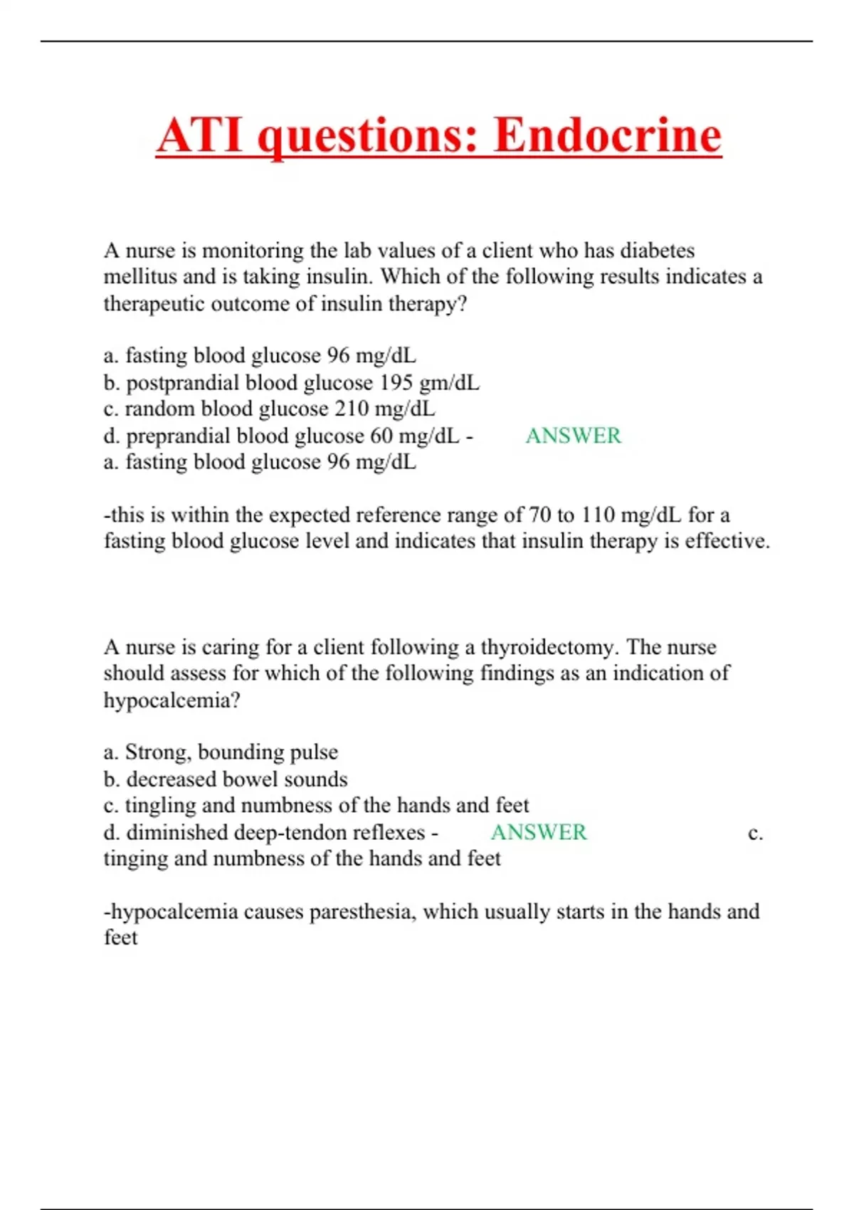 ATI questions: Endocrine A nurse is monitoring the lab values of a client who has diabetes mellitus and is taking insulin. Which of the following results indicates a therapeutic outcome of insulin therapy? a. fasting blood glucose 96 mg/dL b. postprandial blood glucose 195 gm/dL c. random blood glucose 210 mg/dL d. preprandial blood glucose 60 mg/dL - ANSWER a. fasting blood glucose 96 mg/dL -this is within the expected reference range of 70 to 110 mg/dL for a fasting blood glucose level and indicates that insulin therapy is effective. A nurse is caring for a client following a thyroidectomy. The nurse should assess for which of the following findings as an indication of hypocalcemia? a. Strong, bounding pulse b. decreased bowel sounds c. tingling and numbness of the hands and feet d. diminished deep-tendon reflexes - ANSWER c. tinging and numbness of the hands and feet -hypocalcemia causes paresthesia, which usually starts in the hands and feet