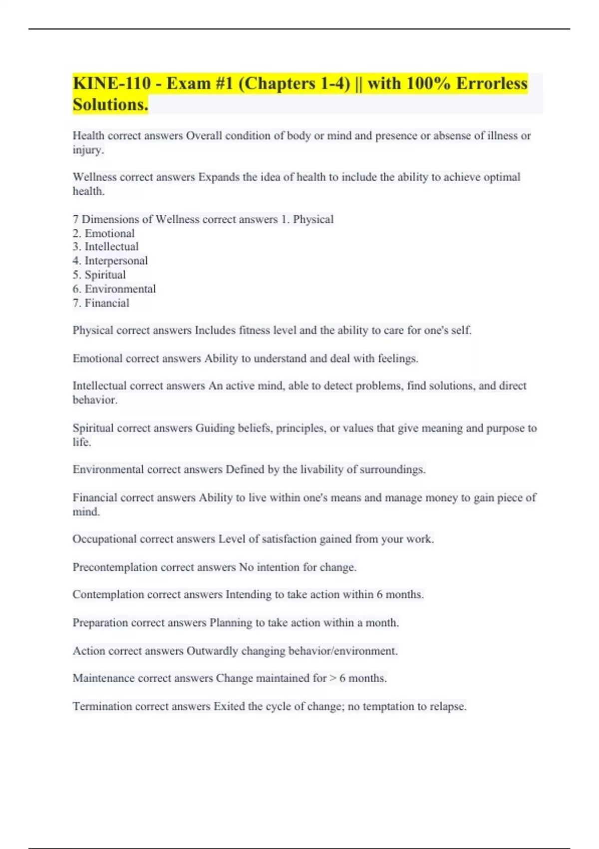 Health correct answers Overall condition of body or mind and presence or absense of illness or injury. Wellness correct answers Expands the idea of health to include the ability to achieve optimal health. 7 Dimensions of Wellness correct answers 1. Physical 2. Emotional 3. Intellectual 4. Interpersonal 5. Spiritual 6. Environmental 7. Financial Physical correct answers Includes fitness level and the ability to care for one's self. Emotional correct answers Ability to understand and deal with feelings. Intellectual correct answers An active mind, able to detect problems, find solutions, and direct behavior. Spiritual correct answers Guiding beliefs, principles, or values that give meaning and purpose to life. Environmental correct answers Defined by the livability of surroundings. Financial correct answers Ability to live within one's means and manage money to gain piece of mind. Occupational correct answers Level of satisfaction gained from your work. Precontemplation correct answers No intention for change. Contemplation correct answers Intending to take action within 6 months. Preparation correct answers Planning to take action within a month. Action correct answers Outwardly changing behavior/environment. Maintenance correct answers Change maintained for > 6 months. Termination correct answers Exited the cycle of change; no temptation to relapse.