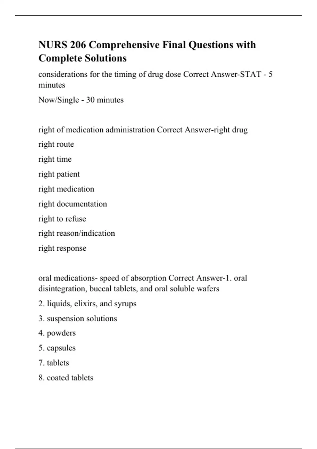 considerations for the timing of drug dose Correct Answer-STAT - 5 minutes Now/Single - 30 minutes right of medication administration Correct Answer-right drug right route right time right patient right medication right documentation right to refuse right reason/indication right response oral medications- speed of absorption Correct Answer-1. oral disintegration, buccal tablets, and oral soluble wafers 2. liquids, elixirs, and syrups 3. suspension solutions 4. powders 5. capsules 7. tablets 8. coated tablets 9. enteric-coated tablets