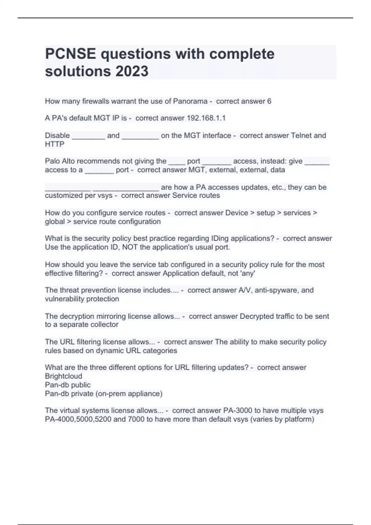 PCNSE questions with complete solutions 2023(UPDATED)PCNSE questions with complete solutions 2023 How many firewalls warrant the use of Panorama - correct answer 6 A PA's default MGT IP is - correct answer 192.168.1.1 Disable ________ and _________ on the MGT interface - correct answer Telnet and HTTP Palo Alto recommends not giving the ____ port _______ access, instead: give ______ access to a _______ port - correct answer MGT, external, external, data ___________ ________________ are how a PA accesses updates, etc., they can be customized per vsys - correct answer Service routes How do you configure service routes - correct answer Device > setup > services > global > service route configuration What is the security policy best practice regarding IDing applications? - correct answer Use the application ID, NOT the application's usual port. How should you leave the service tab configured in a security policy rule for the most effective filtering? - correct answer Application default, not 'any' The threat prevention license includes.... - correct answer A/V, anti-spyware, and vulnerability protection The decryption mirroring license allows... - correct answer Decrypted traffic to be sent to a separate collector The URL filtering license allows... - correct answer The ability to make security policy rules based on dynamic URL categories