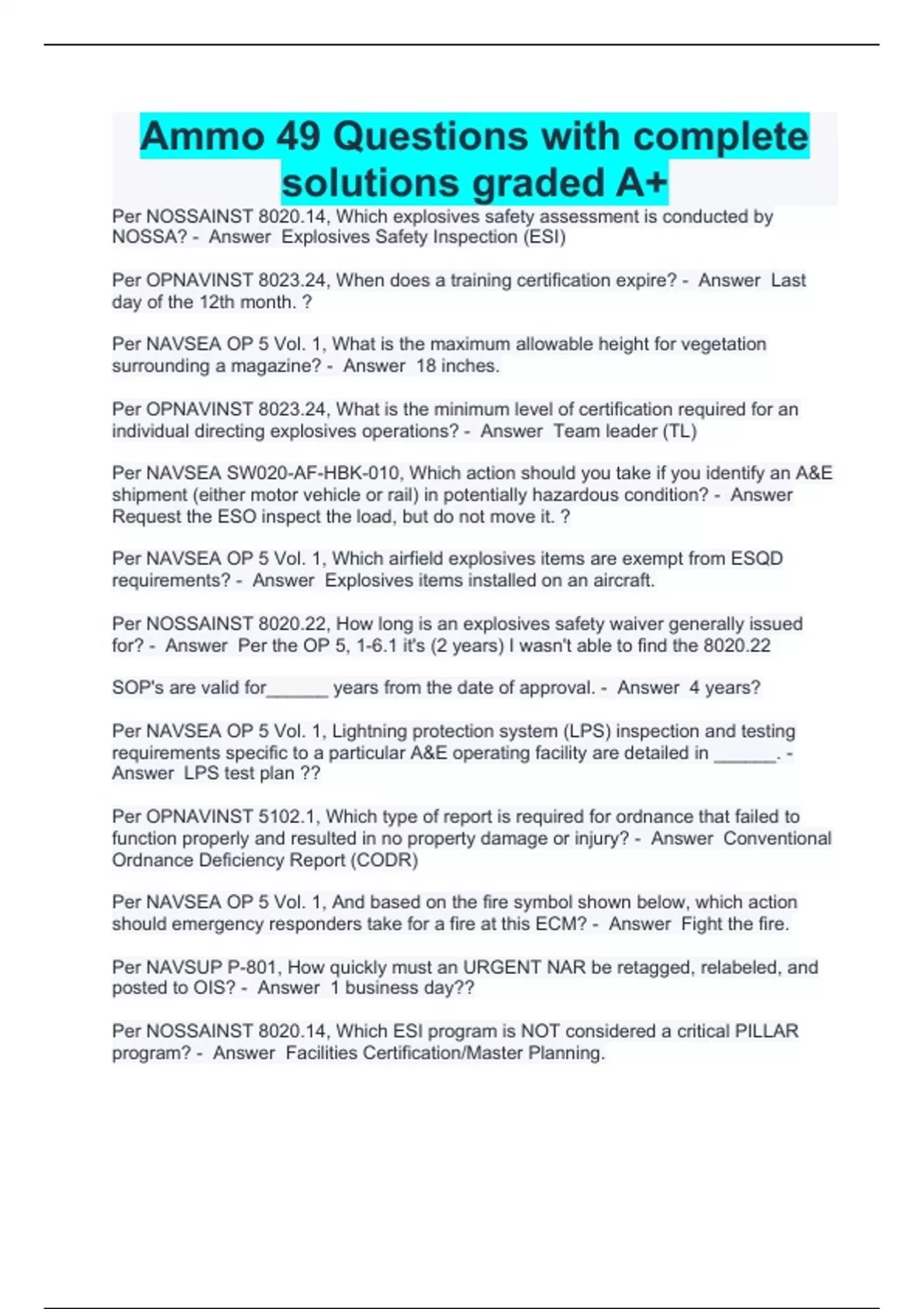 Ammo 49 Questions with complete solutions graded A+ Per NOSSAINST 8020.14, Which explosives safety assessment is conducted by NOSSA? - Answer Explosives Safety Inspection (ESI) Per OPNAVINST 8023.24, When does a training certification expire? - Answer Last day of the 12th month. ? Per NAVSEA OP 5 Vol. 1, What is the maximum allowable height for vegetation surrounding a magazine? - Answer 18 inches. Per OPNAVINST 8023.24, What is the minimum level of certification required for an individual directing explosives operations? - Answer Team leader (TL) Per NAVSEA SW020-AF-HBK-010, Which action should you take if you identify an A&E shipment (either motor vehicle or rail) in potentially hazardous condition? - Answer Request the ESO inspect the load, but do not move it. ? Per NAVSEA OP 5 Vol. 1, Which airfield explosives items are exempt from ESQD requirements? - Answer Explosives items installed on an aircraft. Per NOSSAINST 8020.22, How long is an explosives safety waiver generally issued for? - Answer Per the OP 5, 1-6.1 it's (2 years) I wasn't able to find the 8020.22 SOP's are valid for______ years from the date of approval. - Answer 4 years? Per NAVSEA OP 5 Vol. 1, Lightning protection system (LPS) inspection and testing requirements specific to a particular A&E operating facility are detailed in ______. - Answer LPS test plan ?? Per OPNAVINST 5102.1, Which type of report is required for ordnance that failed to function properly and resulted in no property damage or injury? - Answer Conventional Ordnance Deficiency Report (CODR) Per NAVSEA OP 5 Vol. 1, And based on the fire symbol shown below, which action should emergency responders take for a fire at this ECM? - An