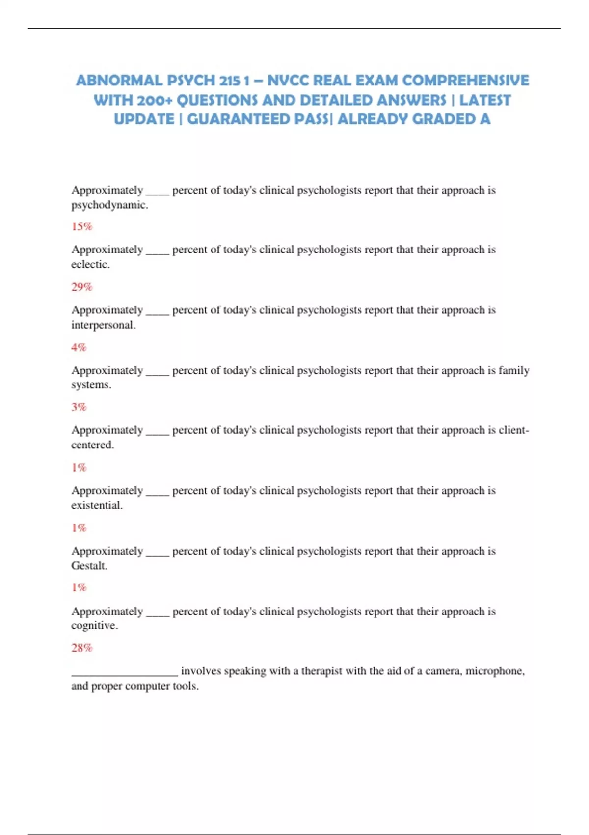 centered. 1% Approximately ____ percent of today's clinical psychologists report that their approach is existential. 1% Approximately ____ percent of today's clinical psychologists report that their approach is Gestalt. 1% Approximately ____ percent of today's clinical psychologists report that their approach is cognitive. 28% __________________ involves speaking with a therapist with the aid of a camera, microphone, and proper computer tools. Audio -visual e -therapy _____________________ ____ is a new cognitive therapy that helps clients to accept many of their problematic thoughts rather than judge them, act on them, or try fruitlessly to change them. Acceptance and Commitment Therapy They believe that people must have an accurate awarene ss of themselves and live meaningfully in order to be psychologically well adjusted. Existentialists This tiny space separates one neuron from the next. synapse Every chromosome contains numerous genes, and each cell contains between __________ and _______ ___ genes. 30,000 -40,000 Julie would have bouts of depression followed by periods of normalcy. On her last admission, she presented with increased excitability, euphoric mood, and rapid speech. She was prescribed which of the following medications? mood st abilizers The _________ operates on the pleasure principle, while the __________ operates on the reality principle. id; ego According to Freud, this is the psychological force that represents a person's values and ideals. superego Jane is overweight and he r health is suffering. She explains to her doctor that "food is her only happiness in life and she deserves to be happy." Jane's explanation is an example of: rationalization Many clinicians in the _________ became frustrated with the psychodynamic model w hich gave rise to the behavioral model of abnormality. 50 This is the process of learning in which an individual acquires responses by observing and imitating others. modeling When the dog salivates to the sound of the bell, the bell is the: unconditioned stimulus Approximately ____ percent of today's clinical psychologists report that their approach is behavioral. 10% This therapy encourages the client to accept responsibility for their lives and to live with greater meaning and values. existential therapy In ______________________, therapists works with two individuals who are in a long -term relationship couple's therapy His study in 1973 demonstrated the effect of how labels may encourage people to accept and play the assigned social role. Rosenhan ______ __________ prevention consists of identifying and treating psychological disorders in the early stages, before they become serious. Secondary ________________ prevention consists of efforts to improve community attitudes and policies Primary The goal of __ ______________ prevention is to provide effective treatment as soon as it is needed so that moderate or severe disorders do not become long -term problems Tertiary The humanistic therapy developed by Carl Rogers in which clinicians try to help clients by conveying acceptance, accurate empathy, and genuineness. client -centered therapy The humanistic therapy developed by Fritz Perls in which clinicians actively move clients toward self -recognition and self -acceptance by using techniques such as role playing an d self -