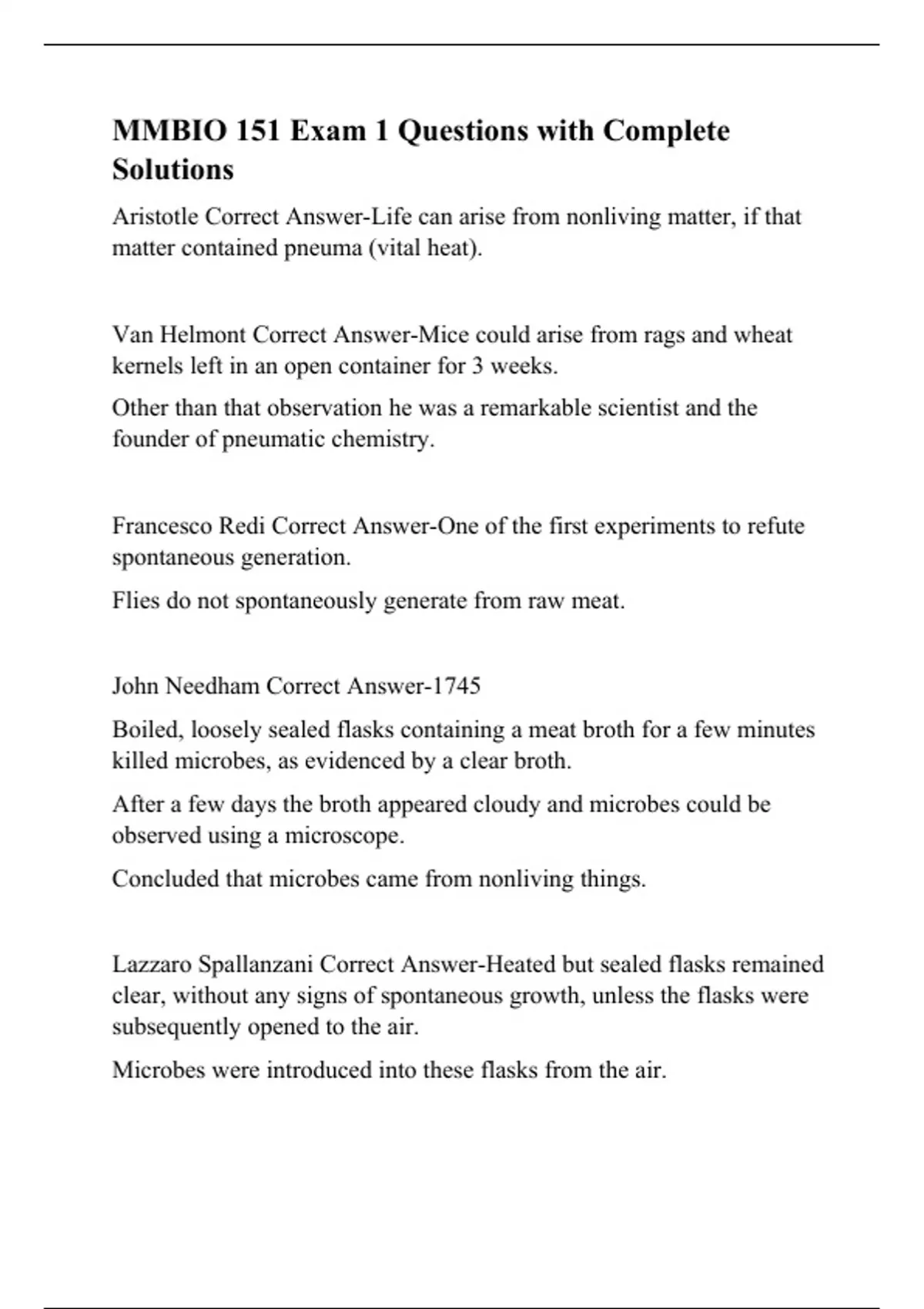 Aristotle Correct Answer-Life can arise from nonliving matter, if that matter contained pneuma (vital heat). Van Helmont Correct Answer-Mice could arise from rags and wheat kernels left in an open container for 3 weeks. Other than that observation he was a remarkable scientist and the founder of pneumatic chemistry. Francesco Redi Correct Answer-One of the first experiments to refute spontaneous generation. Flies do not spontaneously generate from raw meat. John Needham Correct Answer-1745 Boiled, loosely sealed flasks containing a meat broth for a few minutes killed microbes, as evidenced by a clear broth. After a few days the broth appeared cloudy and microbes could be observed using a microscope. Concluded that microbes came from nonliving things. Lazzaro Spallanzani Correct Answer-Heated but sealed flasks remained clear, without any signs of spontaneous growth, unless the flasks were subsequently opened to the air. Microbes were introduced into the