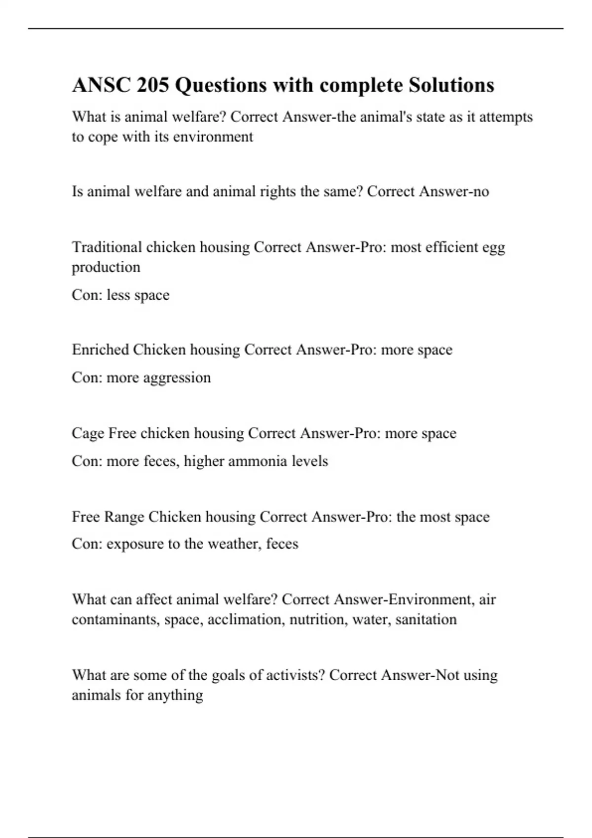 What is animal welfare? Correct Answer-the animal's state as it attempts to cope with its environment Is animal welfare and animal rights the same? Correct Answer-no Traditional chicken housing Correct Answer-Pro: most efficient egg production Con: less space Enriched Chicken housing Correct Answer-Pro: more space Con: more aggression Cage Free chicken housing Correct Answer-Pro: more space Con: more feces, higher ammonia levels Free Range Chicken housing Correct Answer-Pro: the most space Con: exposure to the weather, feces What can affect animal welfare? Correct Answer-Environment, air contaminants, space, acclimation, nutrition, water, sanitation What are some of the goals of activists? Correct Answer-Not using animals for anything