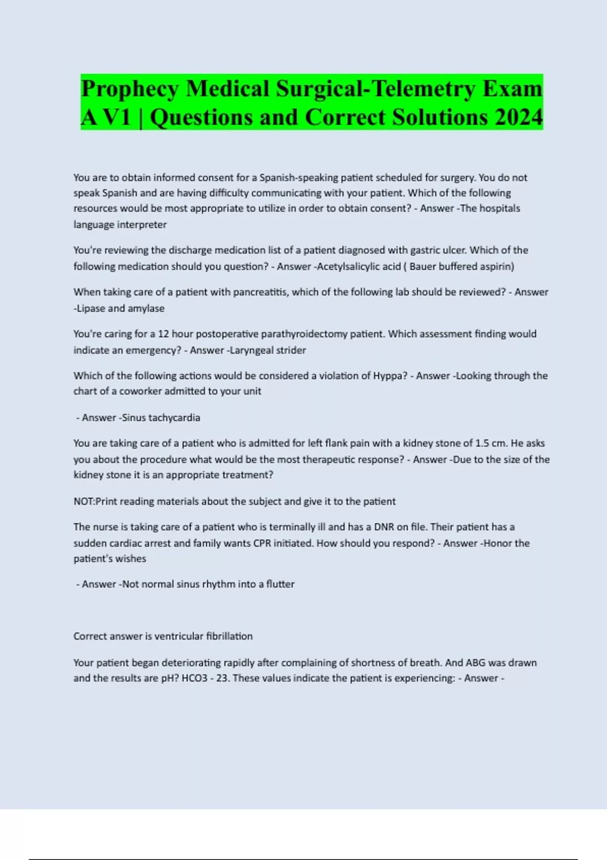 PROPHECY MEDICAL SURGICALTELEMETRY EXAM A V1 EXAM ACTUAL 2025/2026 QUESTIONS AND 100% CORRECT ANSWERS You are to obtain informed consent for a Spanish-speaking patient scheduled for surgery. You do not speak Spanish and are having difficulty communicating with your patient. Which of the following resources would be most appropriate to utilize in order to obtain consent? - Answer -The hospitals language interpreter You're reviewing the discharge medication list of a patient diagnosed with gastric ulcer. Which of the following medication should you question? - Answer -Acetylsalicylic acid ( Bauer buffered aspirin) When taking care of a patient