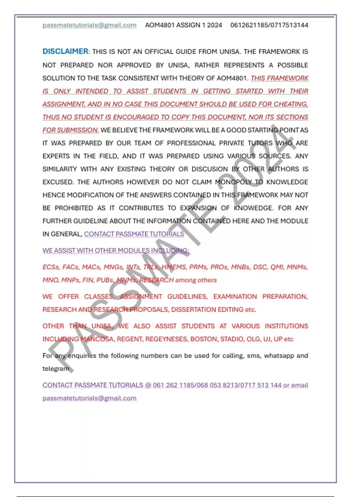 DISCLAIMER: THIS IS NOT AN OFFICIAL GUIDE FROM UNISA. THE FRAMEWORK IS